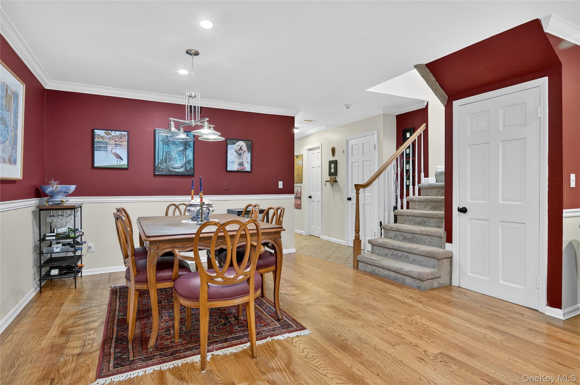 - Dining room featuring stairs, ornamental molding, light wood-type flooring, and recessed lighting
