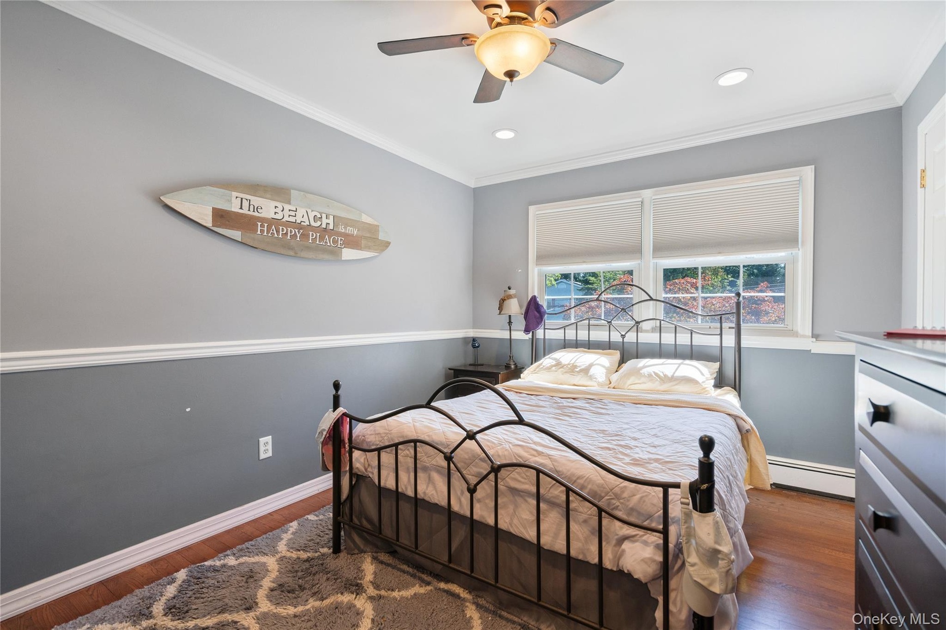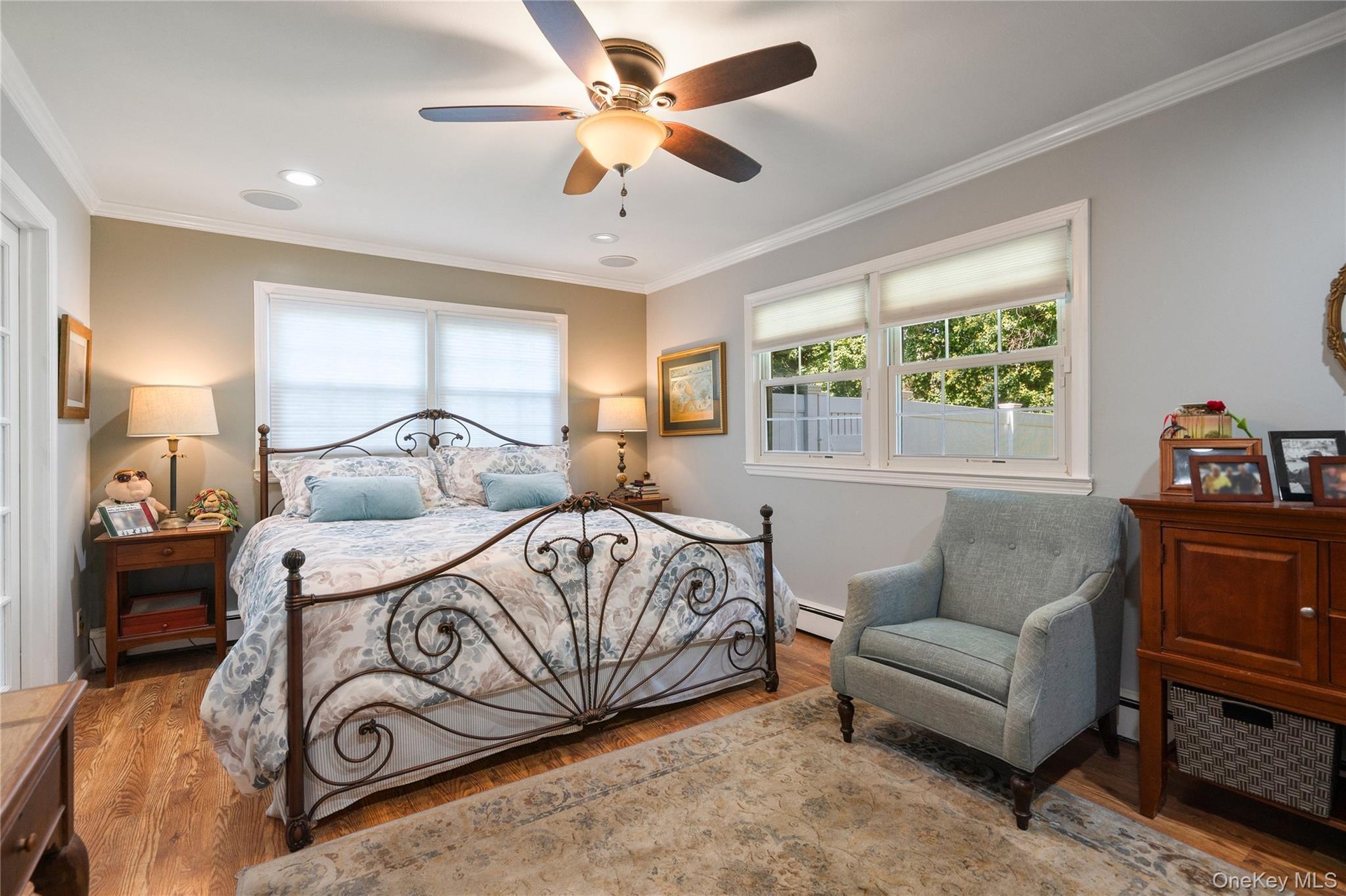- Bedroom featuring wood finished floors, ornamental molding, a baseboard heating unit, a ceiling fan, and recessed lighting
