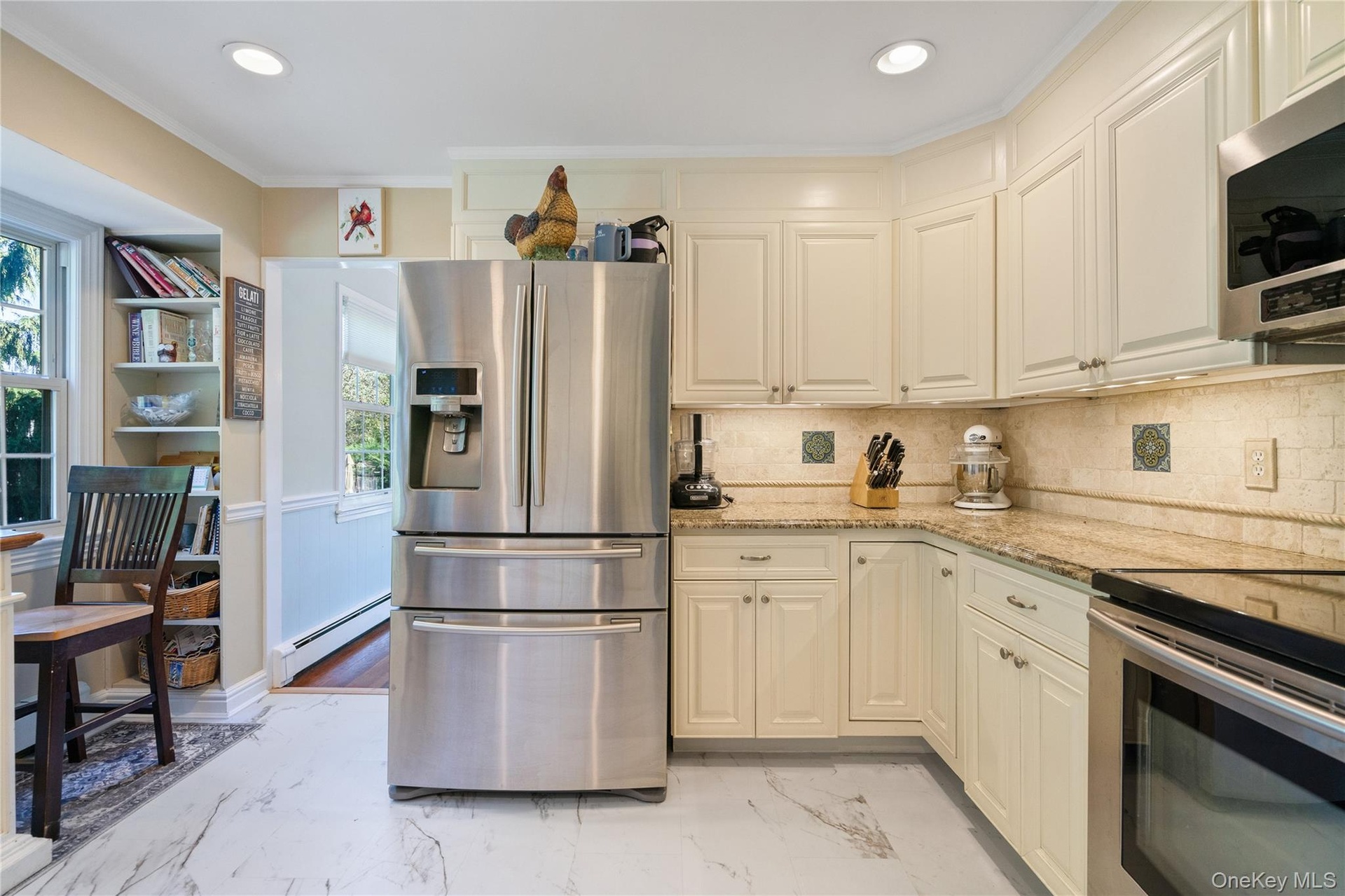 - Kitchen featuring appliances with stainless steel finishes, light marble finish flooring, light stone countertops, backsplash, and a baseboard heating