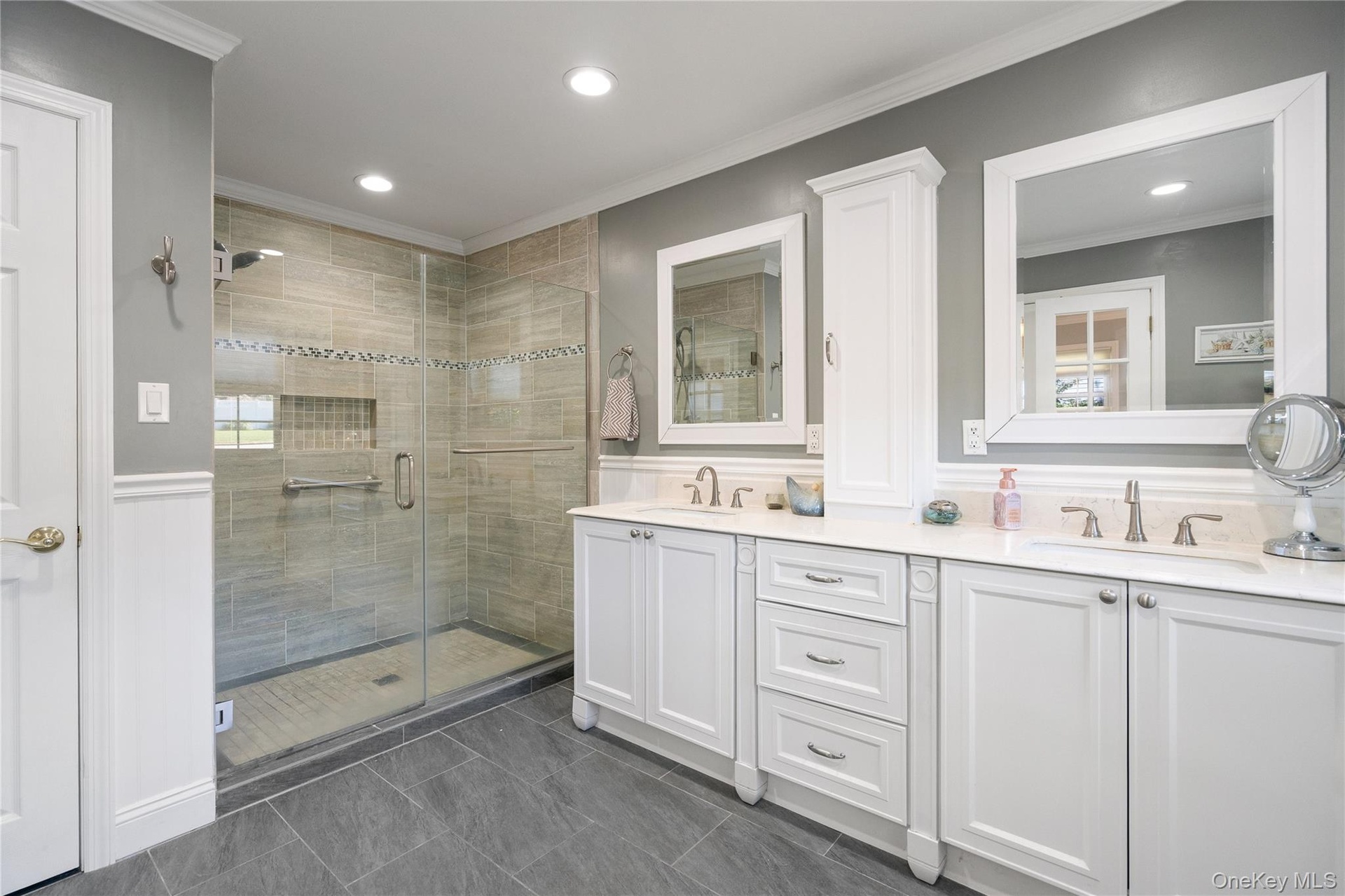 - Full bathroom featuring a stall shower, double vanity, ornamental molding, recessed lighting, and dark tile patterned floors