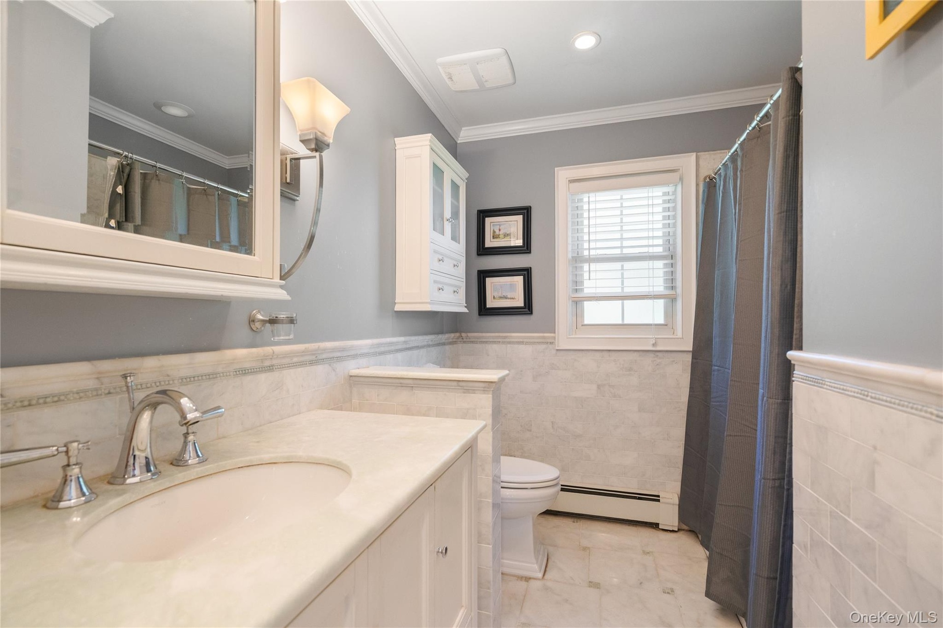 - Bathroom featuring a wainscoted wall, baseboard heating, crown molding, tile walls, and vanity