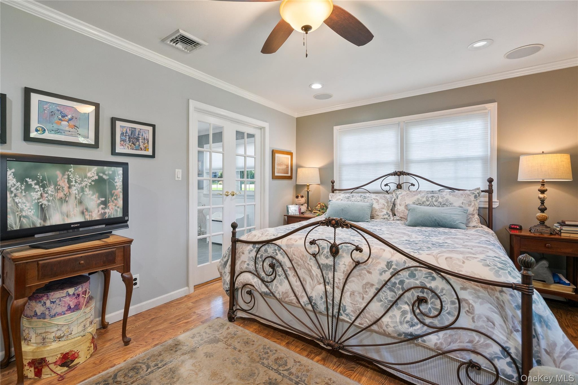 - Bedroom with wood finished floors, crown molding, ceiling fan, french doors, and recessed lighting