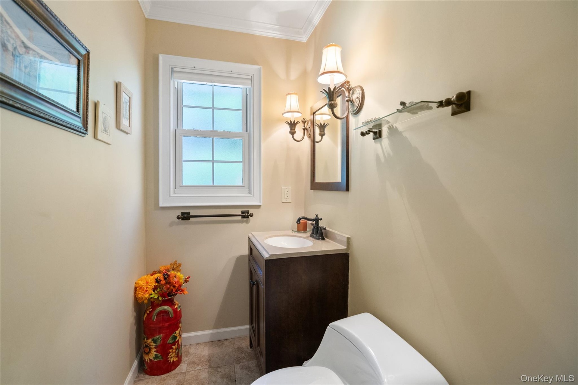 - Bathroom featuring vanity, ornamental molding, and light tile patterned flooring