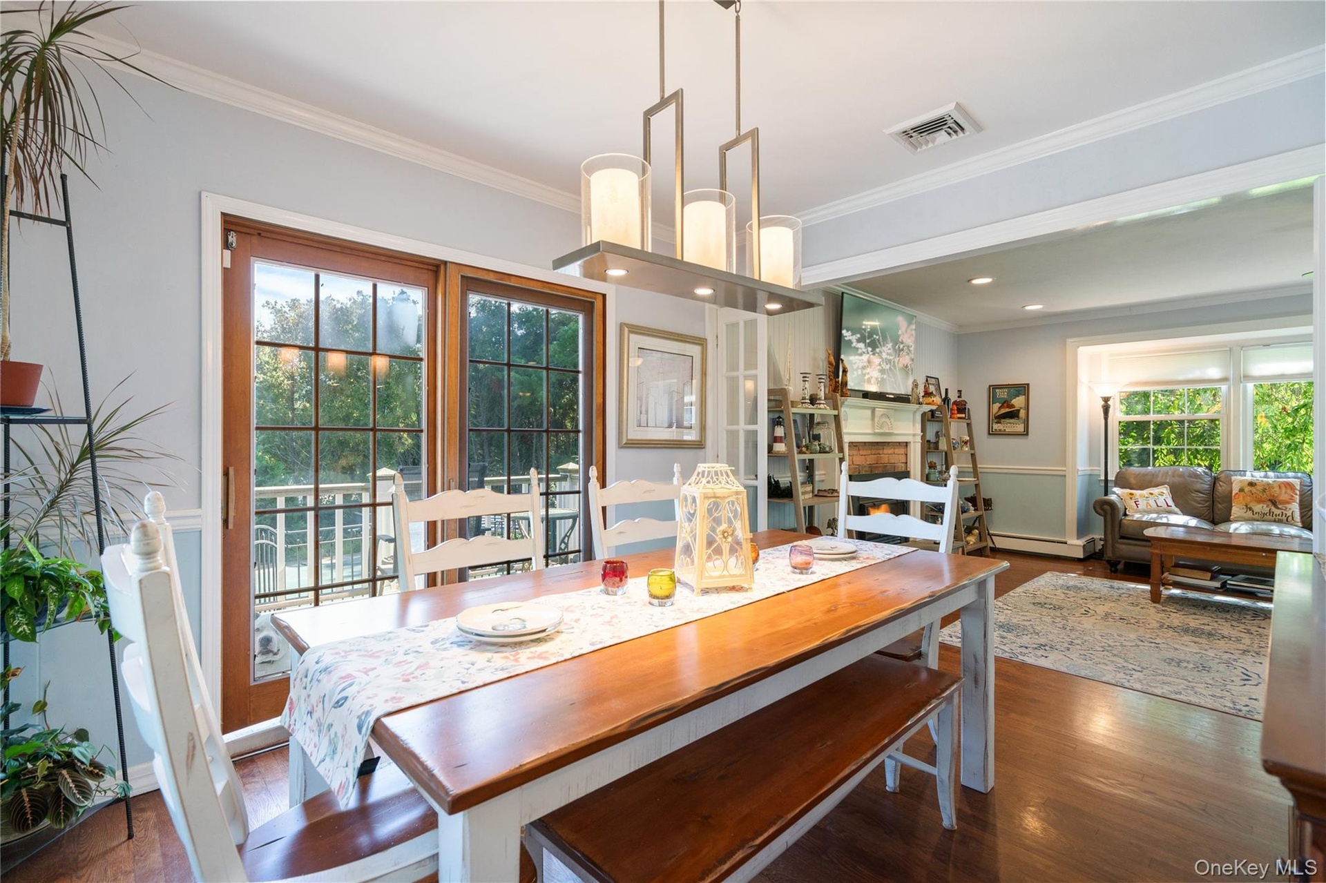 - Dining area with dark wood-style floors, ornamental molding, a warm lit fireplace, and a baseboard heating unit