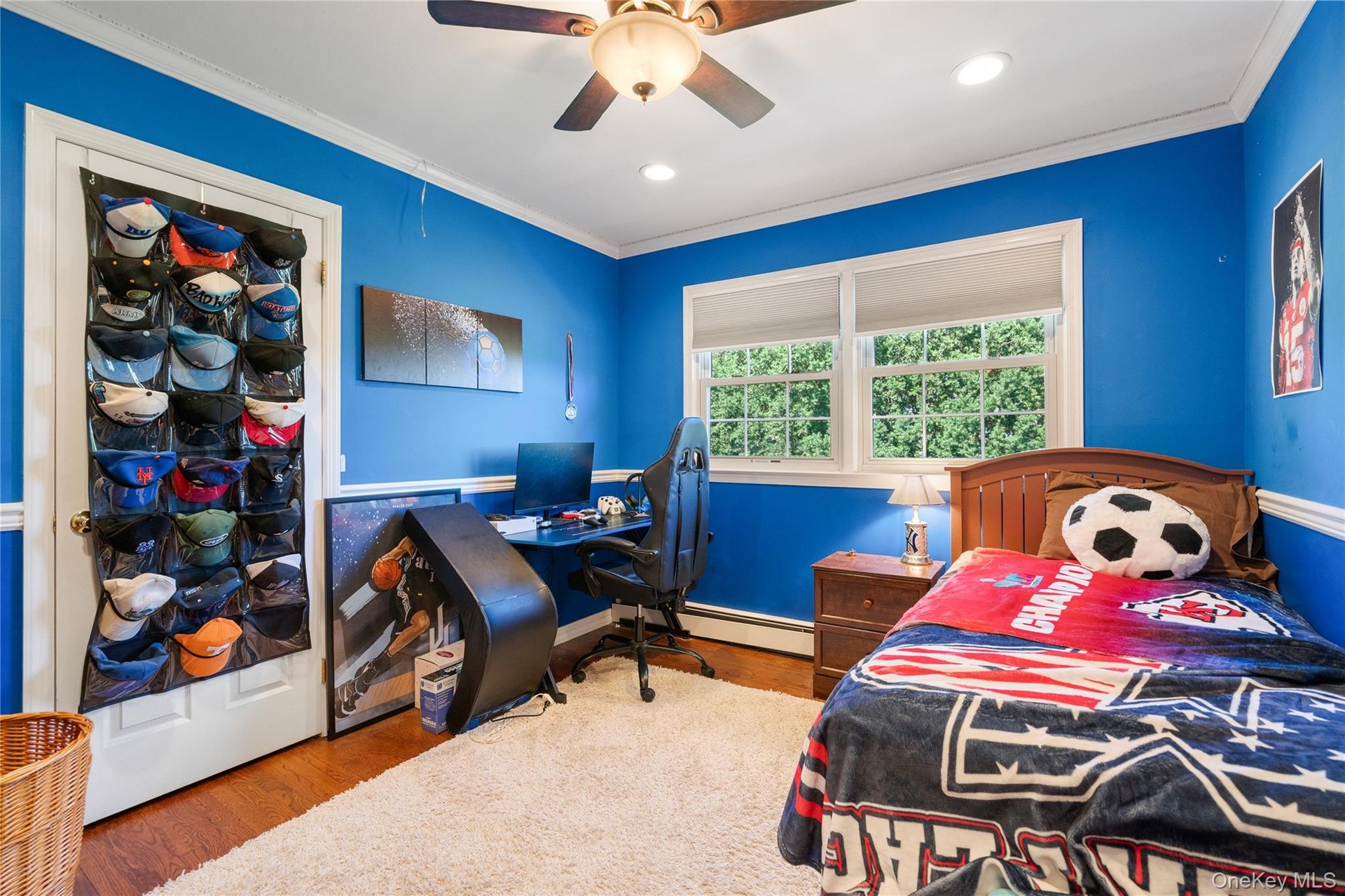 - Bedroom with wood finished floors, ornamental molding, a desk, ceiling fan, and a baseboard radiator