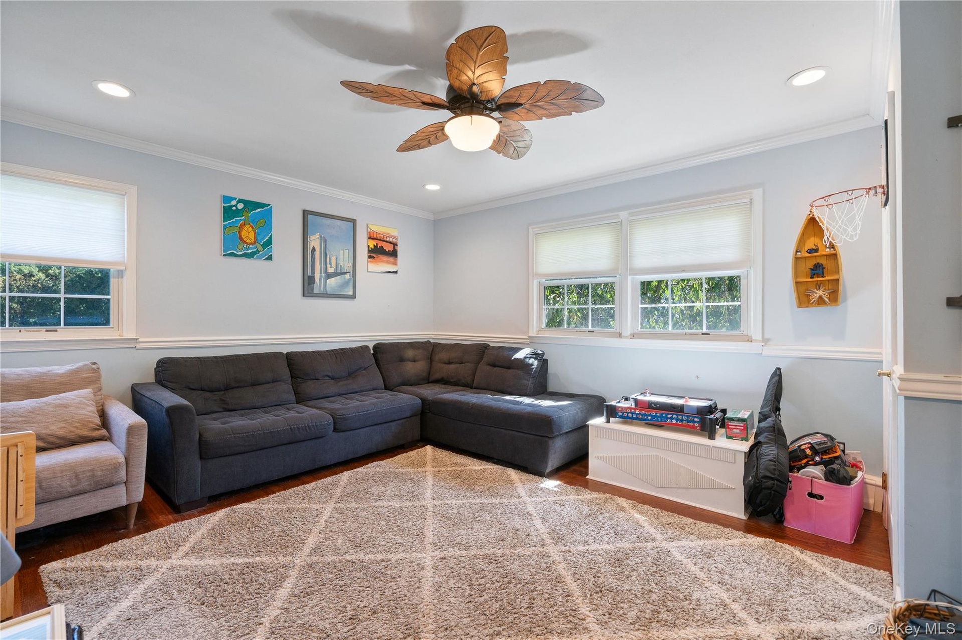 - Living area featuring crown molding, wood finished floors, ceiling fan, and recessed lighting