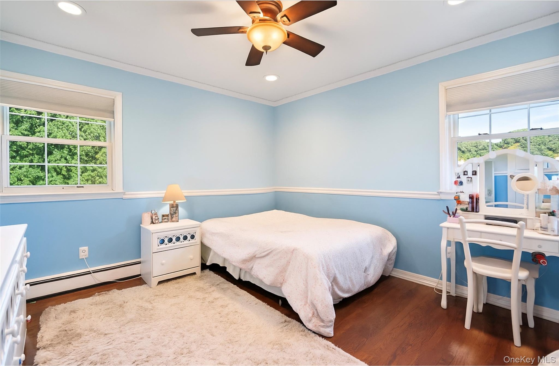 - Bedroom featuring dark wood-type flooring, ornamental molding, baseboard heating, ceiling fan, and recessed lighting
