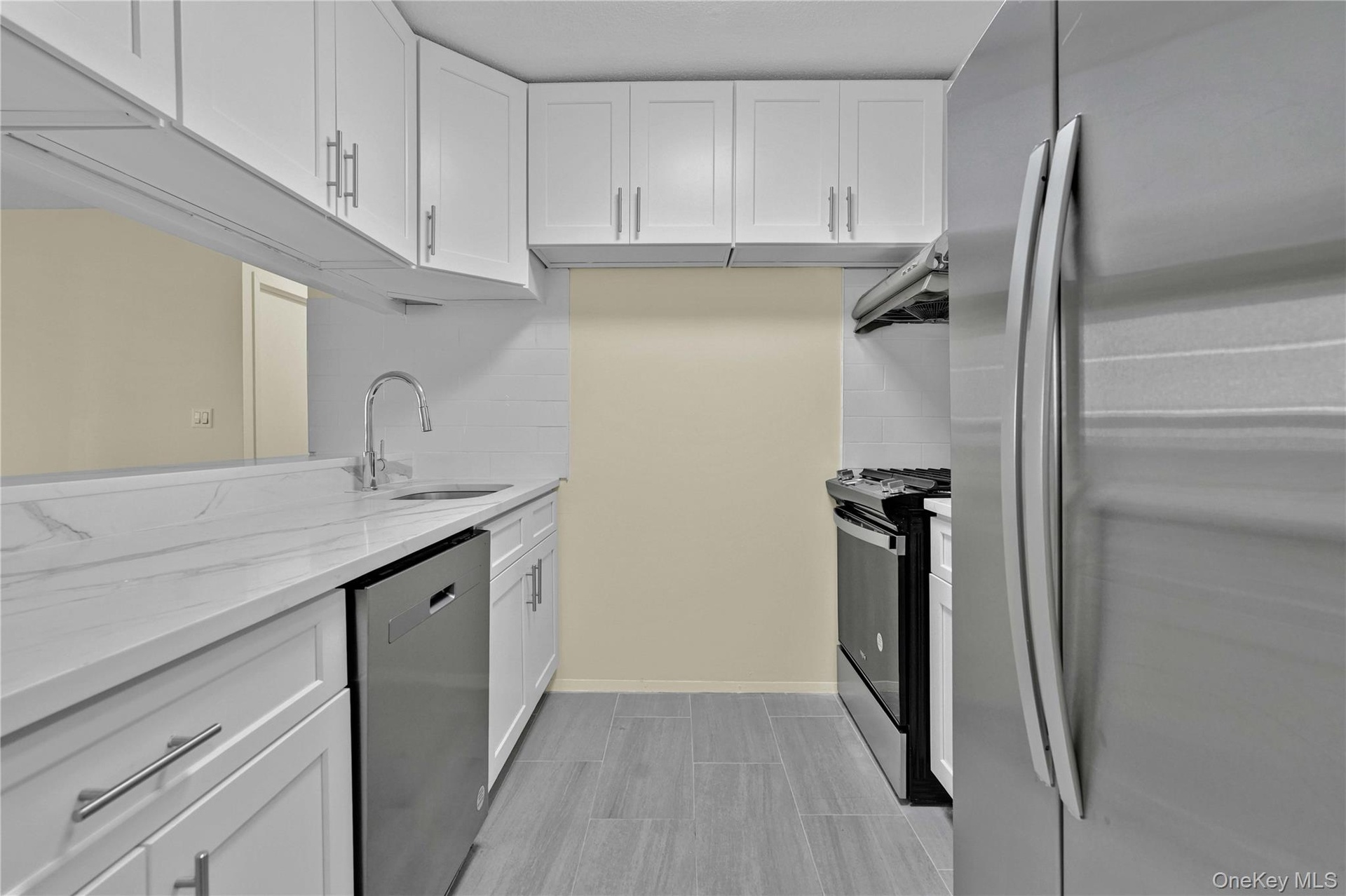 - Kitchen with white cabinetry, stainless steel appliances, light stone counters, backsplash, and under cabinet range hood