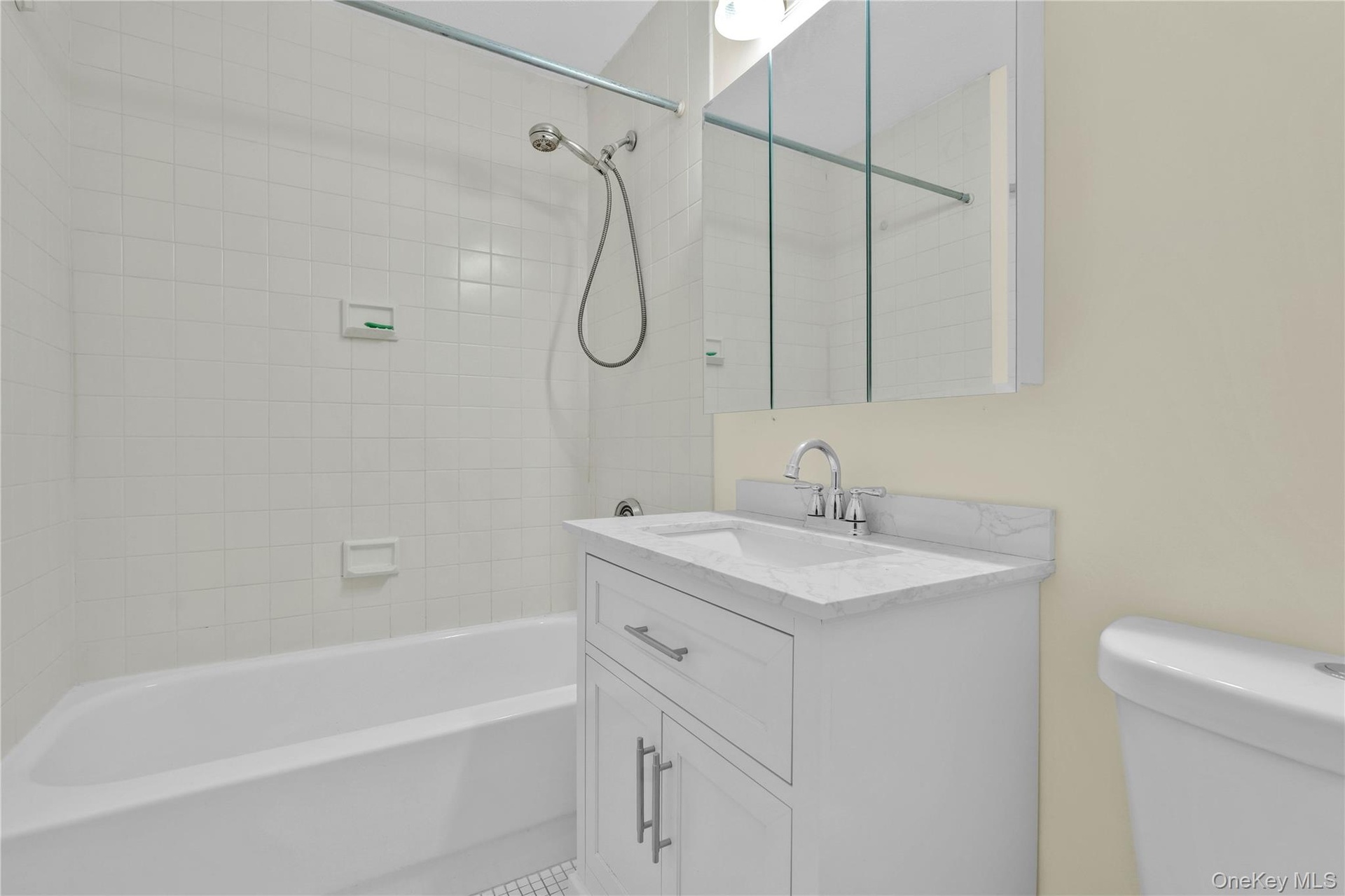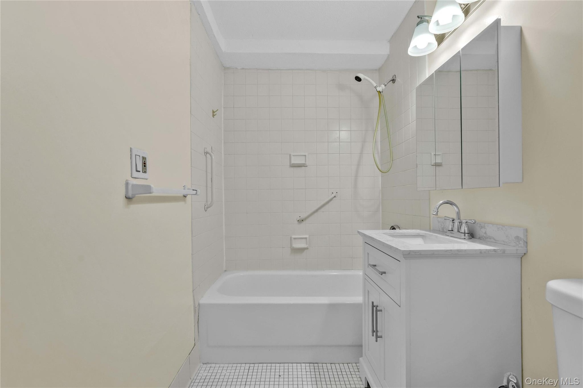 - Full bathroom with shower / tub combination, vanity, and light tile patterned floors