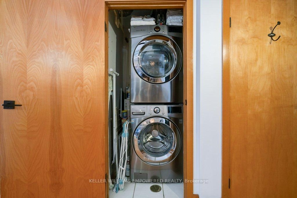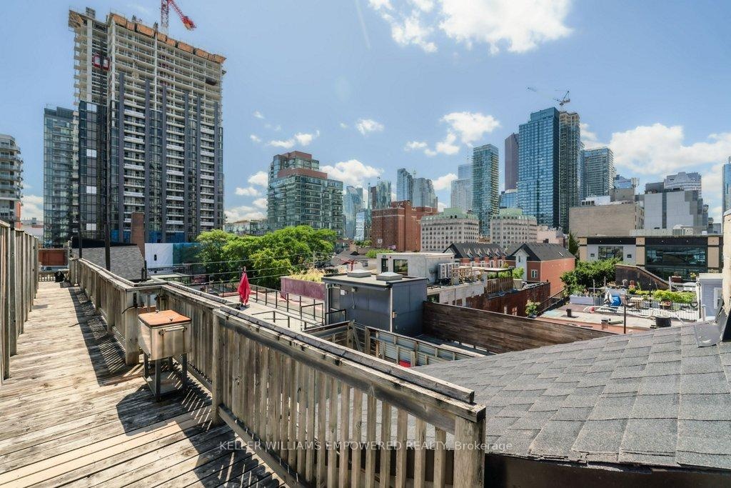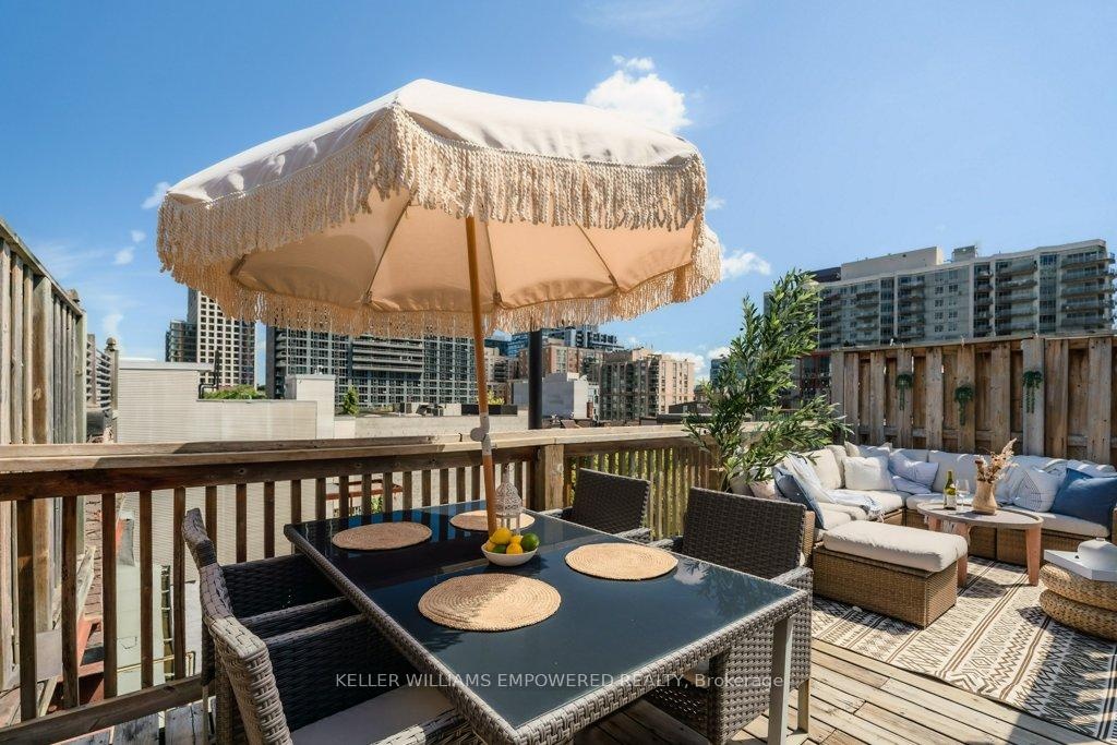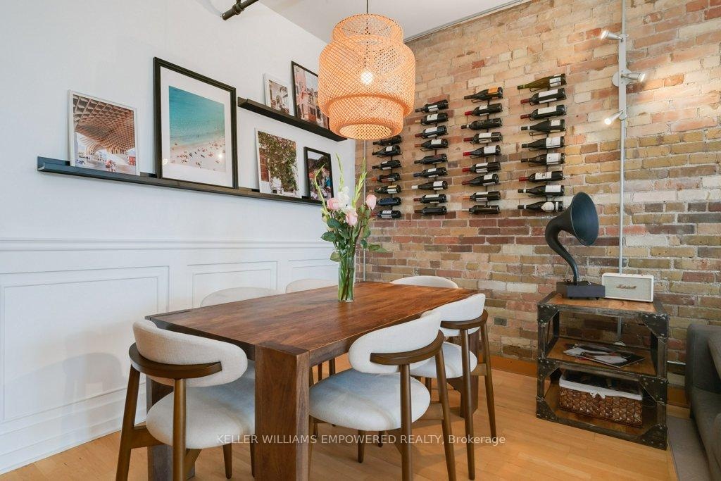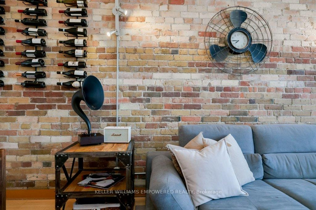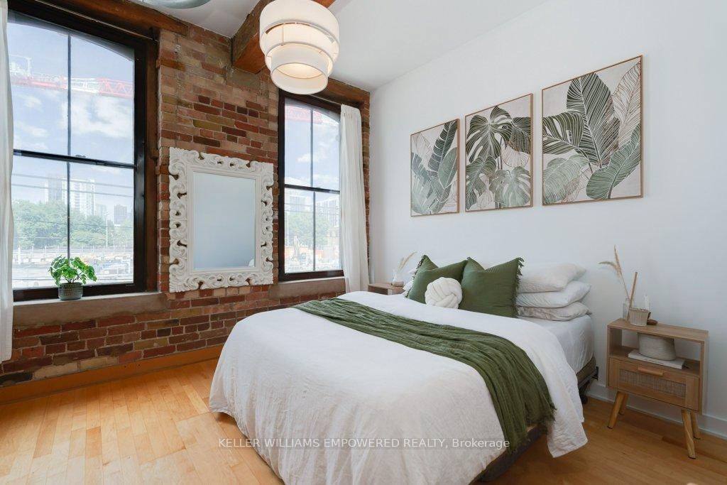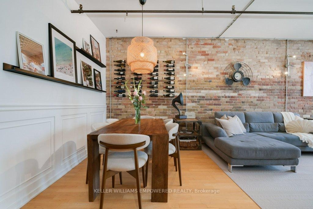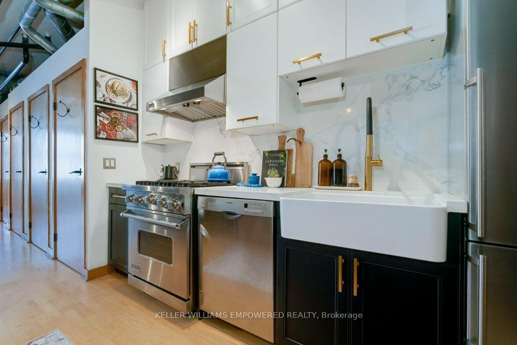 Welcome to Suite 5 of the Boiler Factory Lofts, a boutique heritage conversion with only 11 units. This is a rare opportunity to own a piece of history with exceptional value potential, thanks to the upcoming Ontario Line subway and redesigned park across the street. This true hard loft with low monthly fees offers 890-sqft featuring exposed brick & beams, 10-ft ceilings, oversized windows flooded with natural light, and a 30-ft statement chalkboard wall. The fully upgraded kitchen boasts ceiling-high cabinets and features a Viking professional gas range and hood, Blomberg fridge, Grohe semi-professional faucet, and Franke fireclay farmhouse sink. Thoughtful layout includes spacious bedroom that can easily accommodate a king-sized bed, formal dining area, two closets, ensuite storage unit, and laundry closet. Experience total Zen in your own 243-sqft. private rooftop terrace with striking skyline views, a true urban oasis for relaxing or entertaining. Convenient parking on Britain Street with direct rear access to the building. With a walk score of 98, you are steps to St. Lawrence Market, Distillery District, Financial Core, Eaton Centre, multiple parks, and have quick access to the Gardiner and DVP.