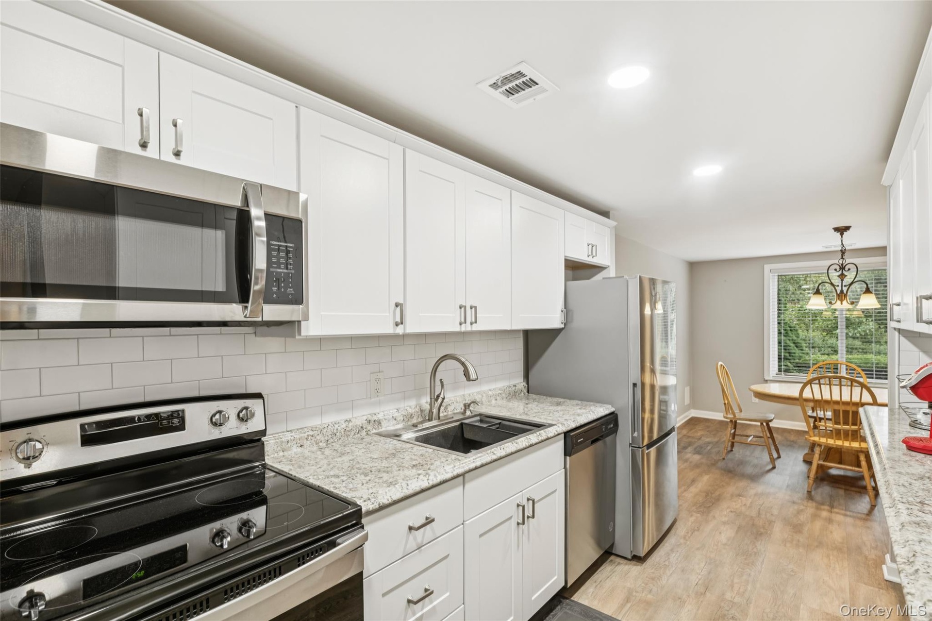 - Kitchen featuring appliances with stainless steel finishes, white cabinetry, light wood finished floors, pendant lighting, and recessed lighting