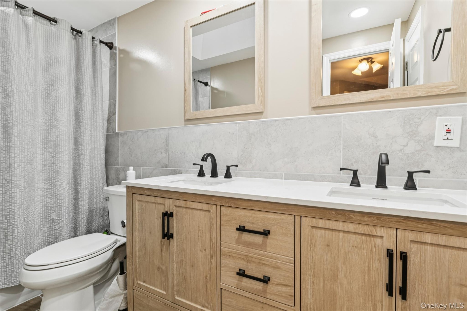 - Full bath featuring double vanity, tile walls, a shower with curtain, and tasteful backsplash