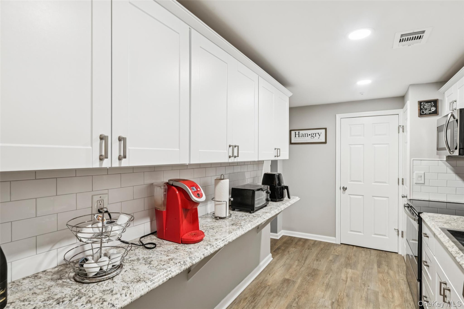 - Kitchen featuring decorative backsplash, light wood-style floors, range with electric stovetop, white cabinets, and recessed lighting