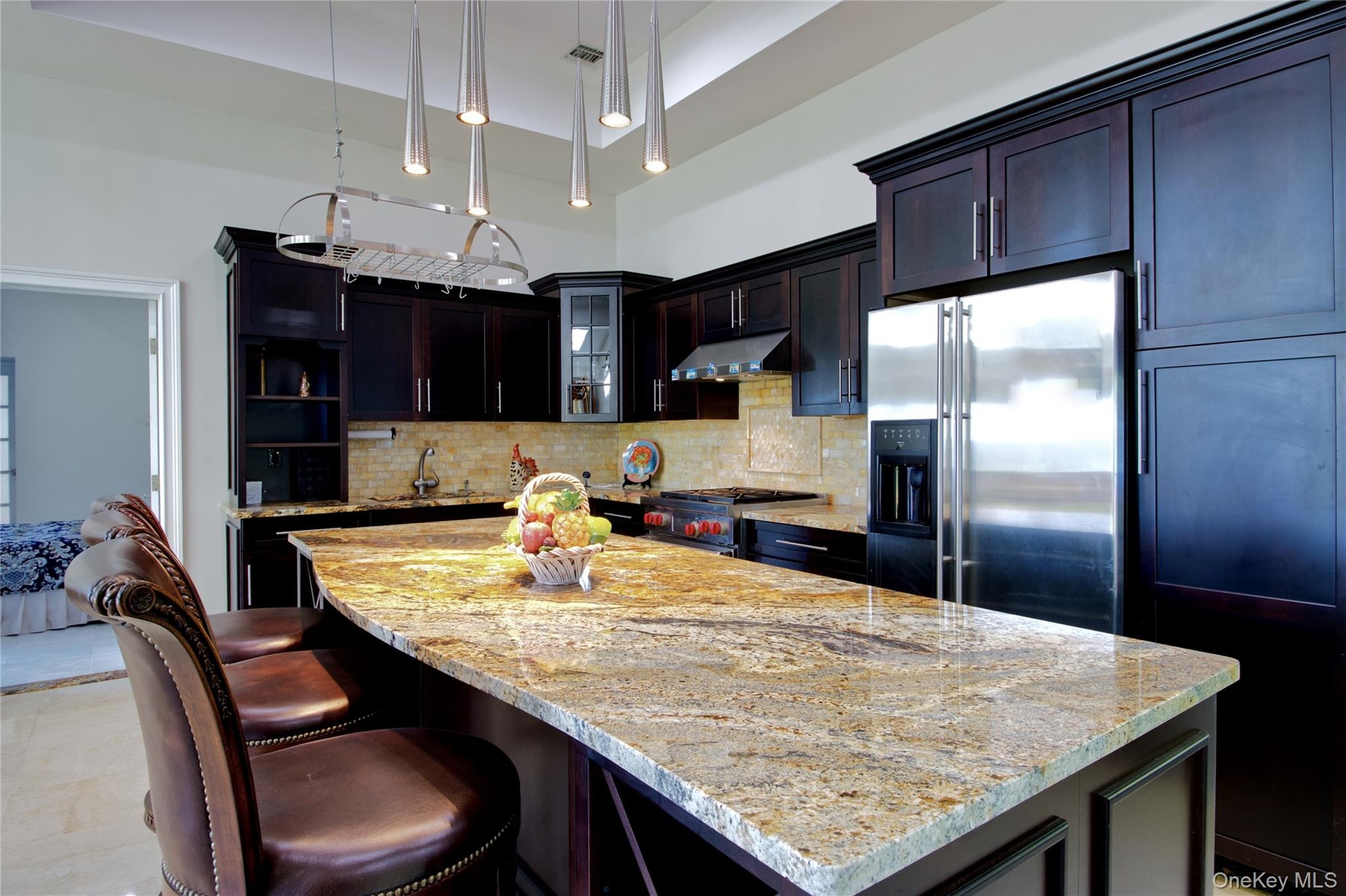 Step inside the dramatic entry foyer where light and space unfold into expansive living areas with floor-to-ceiling windows framing panoramic water views. The main level is highlighted by a sophisticated living room, formal dining room, and a versatile lounge/meeting space. A library with its own bath provides a perfect retreat or guest option. The chef’s kitchen impresses with granite counters, custom cabinetry, professional appliances including three ovens and two dishwashers, and an adjoining laundry/mudroom. A spectacular 1,600 sq. ft. great room with a wet bar and wood-burning fireplace anchors the first floor.
