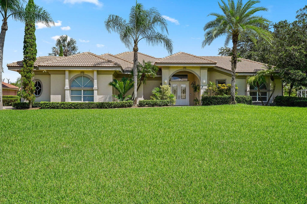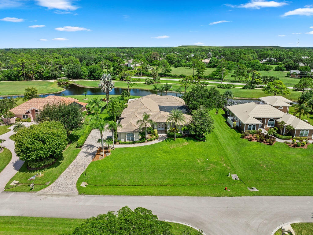 Welcome to 10255 SW Stones Throw Terrace, an exceptional residence located in the highly sought-after gated golf community of Cobblestone in Palm City. This expansive courtyard pool home is designed for both elegance and versatility, offering a 2 bedroom, 2.5 bath main house along with a fully renovated guest house featuring its own bathroom and kitchenette.At the heart of the home is a freeform heated pool with a screened enclosure, perfect for entertaining or enjoying peaceful Florida evenings. A separate screened lanai extends the living space and provides sweeping views of the 8th hole, tranquil lake, and golf course, where you can often spot native wildlife from birds to deer. Inside, the main residence boasts an expansive floor plan with volume ceilings, large butted windows allow