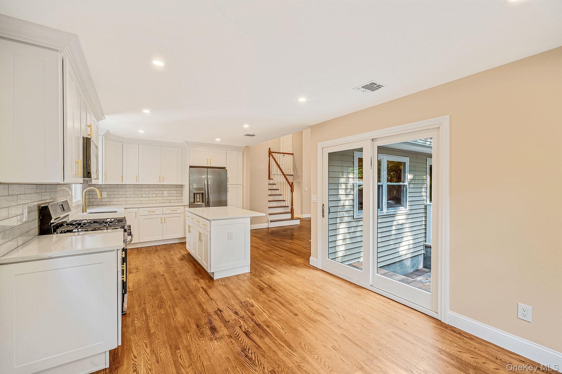- Kitchen with stainless steel appliances, white cabinetry, light wood-type flooring, recessed lighting, and tasteful backsplash