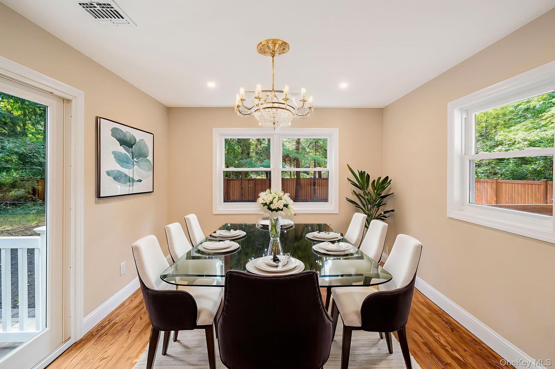 - Dining room featuring light wood-type flooring, a chandelier, and recessed lighting