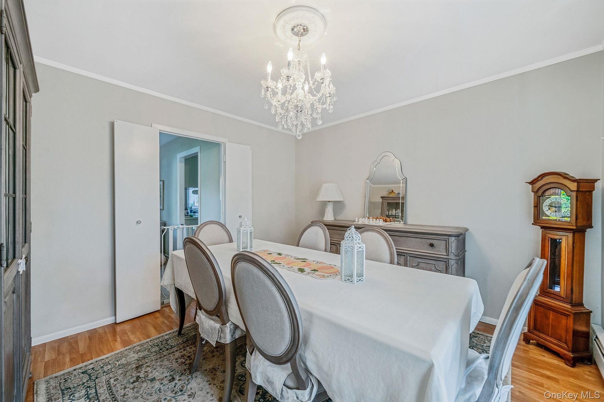 - Dining room with ornamental molding, light wood-style flooring, and a chandelier