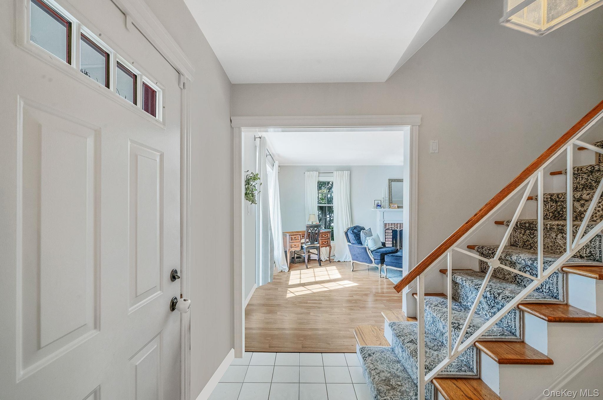 - Entryway featuring light tile patterned flooring, stairs, and a fireplace