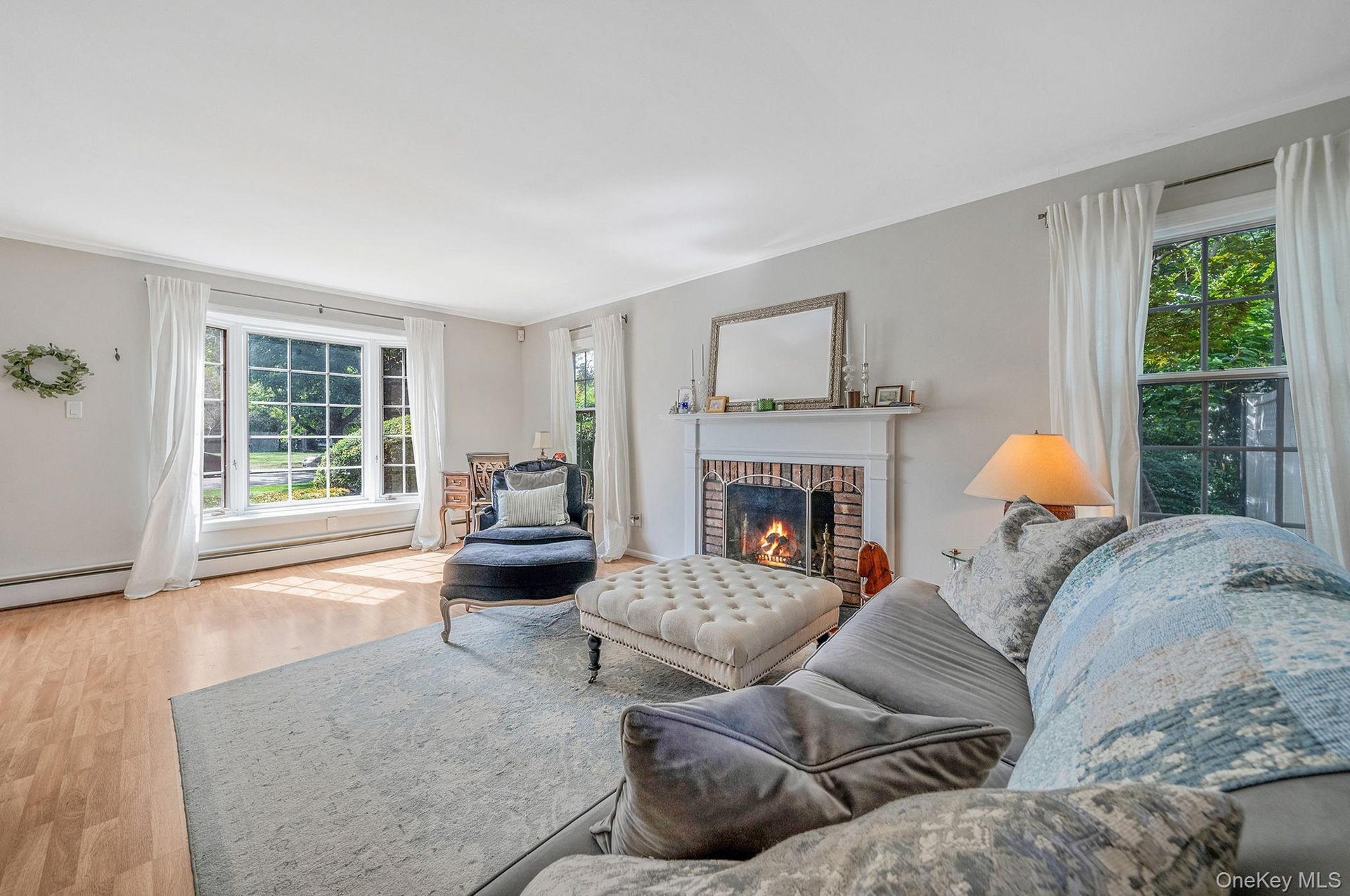- Living area with a brick fireplace, light wood finished floors, and ornamental molding