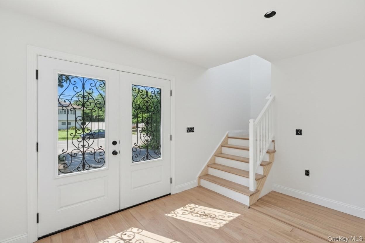- Entrance foyer featuring french doors, stairs, and light wood-style flooring