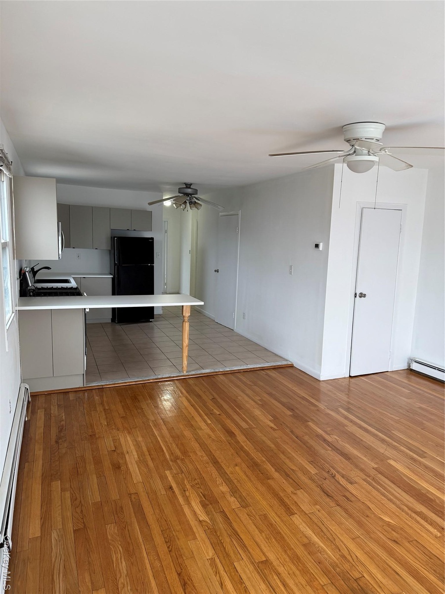 - Unfurnished living room featuring ceiling fan, light wood-style floors, and baseboard heating