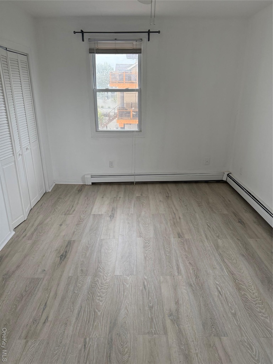 - Unfurnished bedroom with light wood-style floors, baseboard heating, and a closet