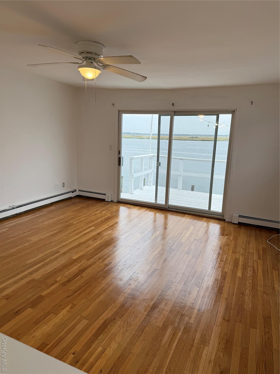 - Spare room featuring light wood-type flooring, a water view, a baseboard heating unit, and ceiling fan