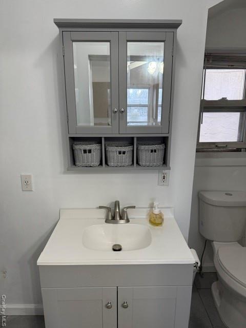 - Bathroom featuring vanity and dark tile patterned flooring