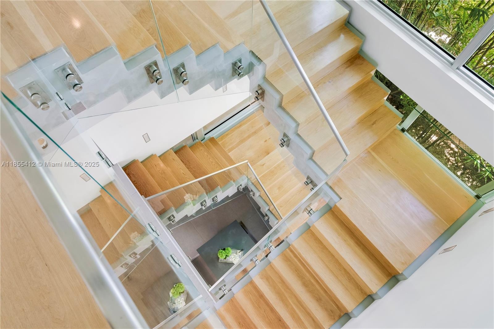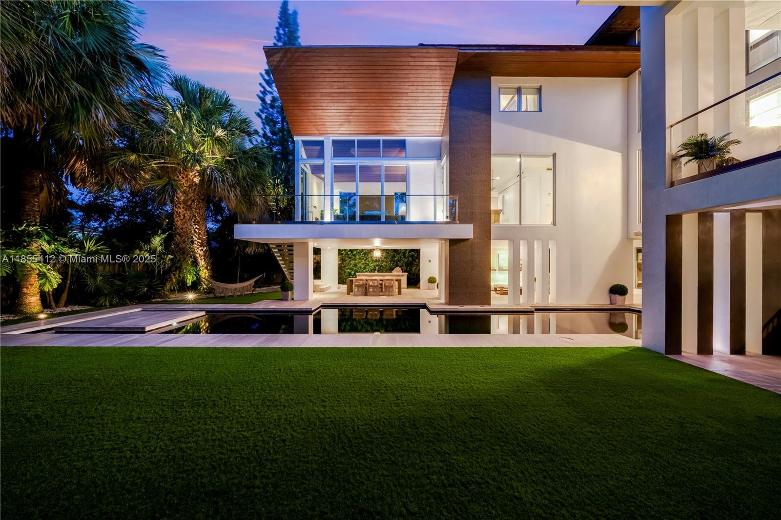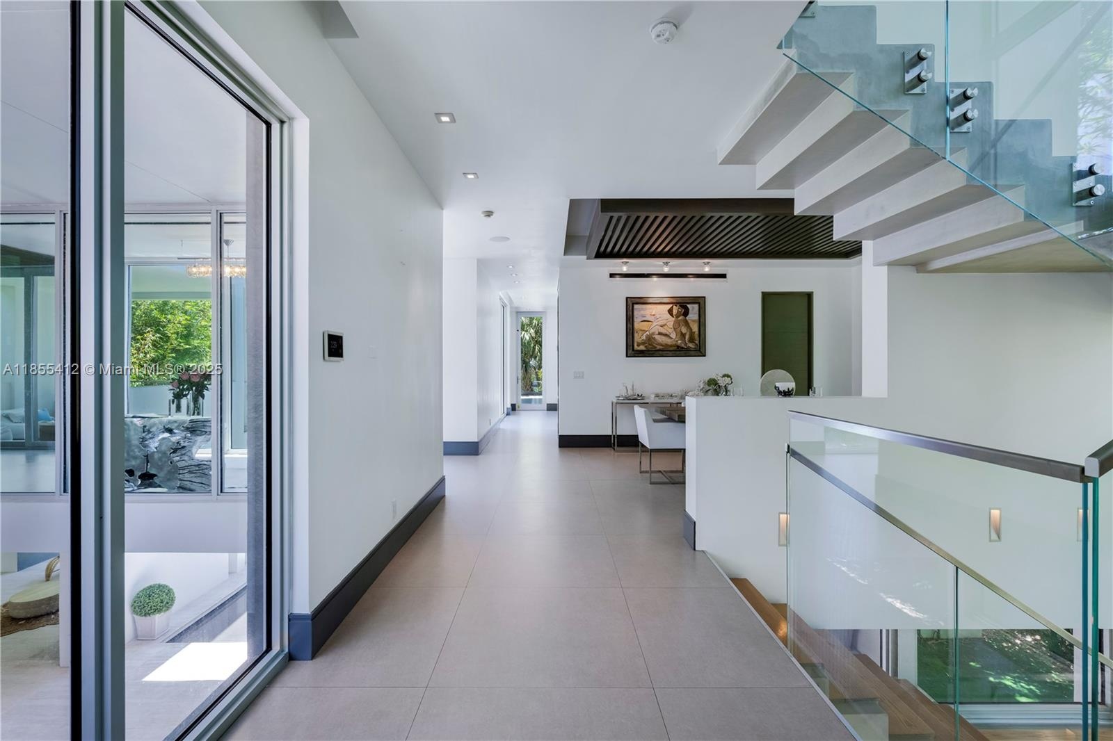 Inside, a glass-walled foyer, soaring ceilings, and a sculptural staircase set the tone. Formal dining, reception, and a chef’s kitchen flow seamlessly for refined living. The master suite offers vaulted ceilings, walk-in closets, a spa bath, and an adjacent office, complemented by three additional en-suite bedrooms.