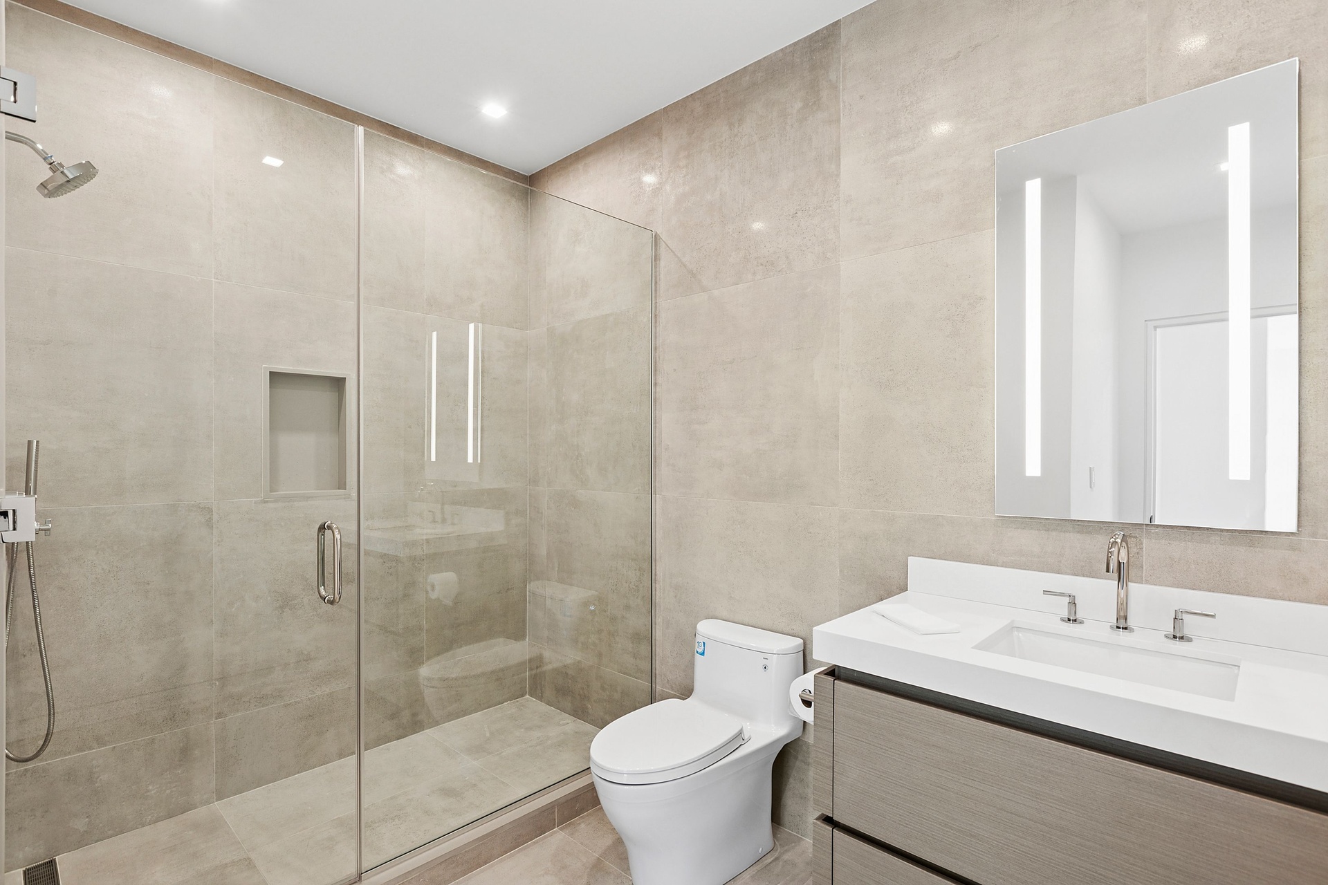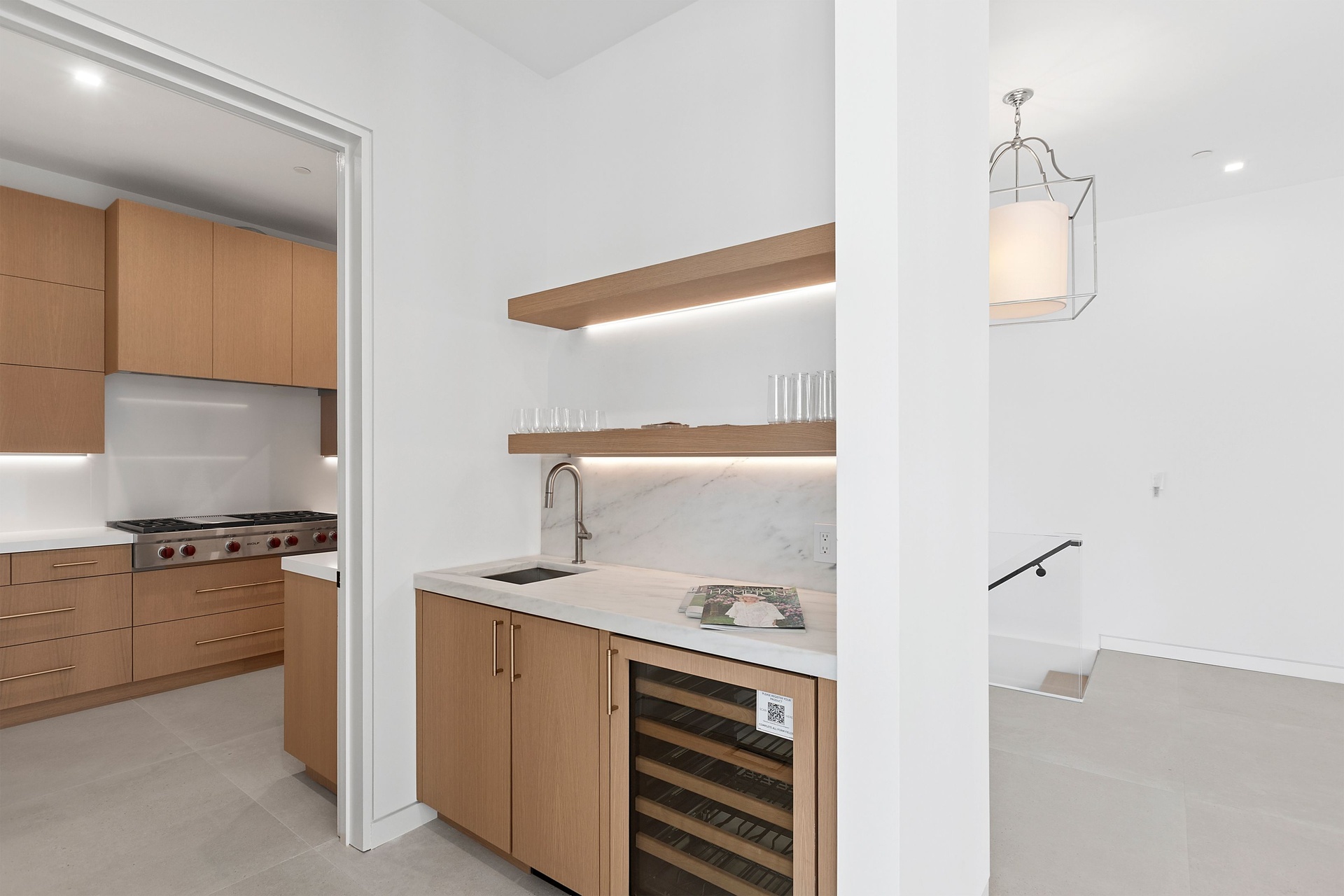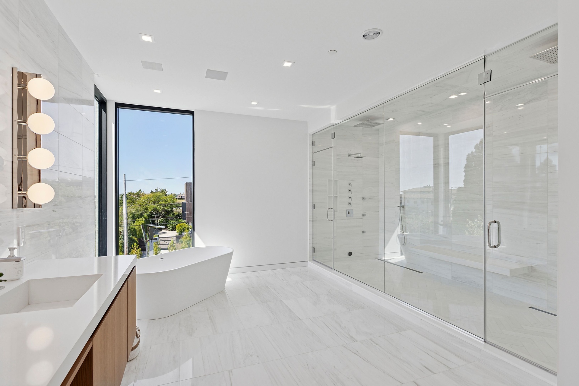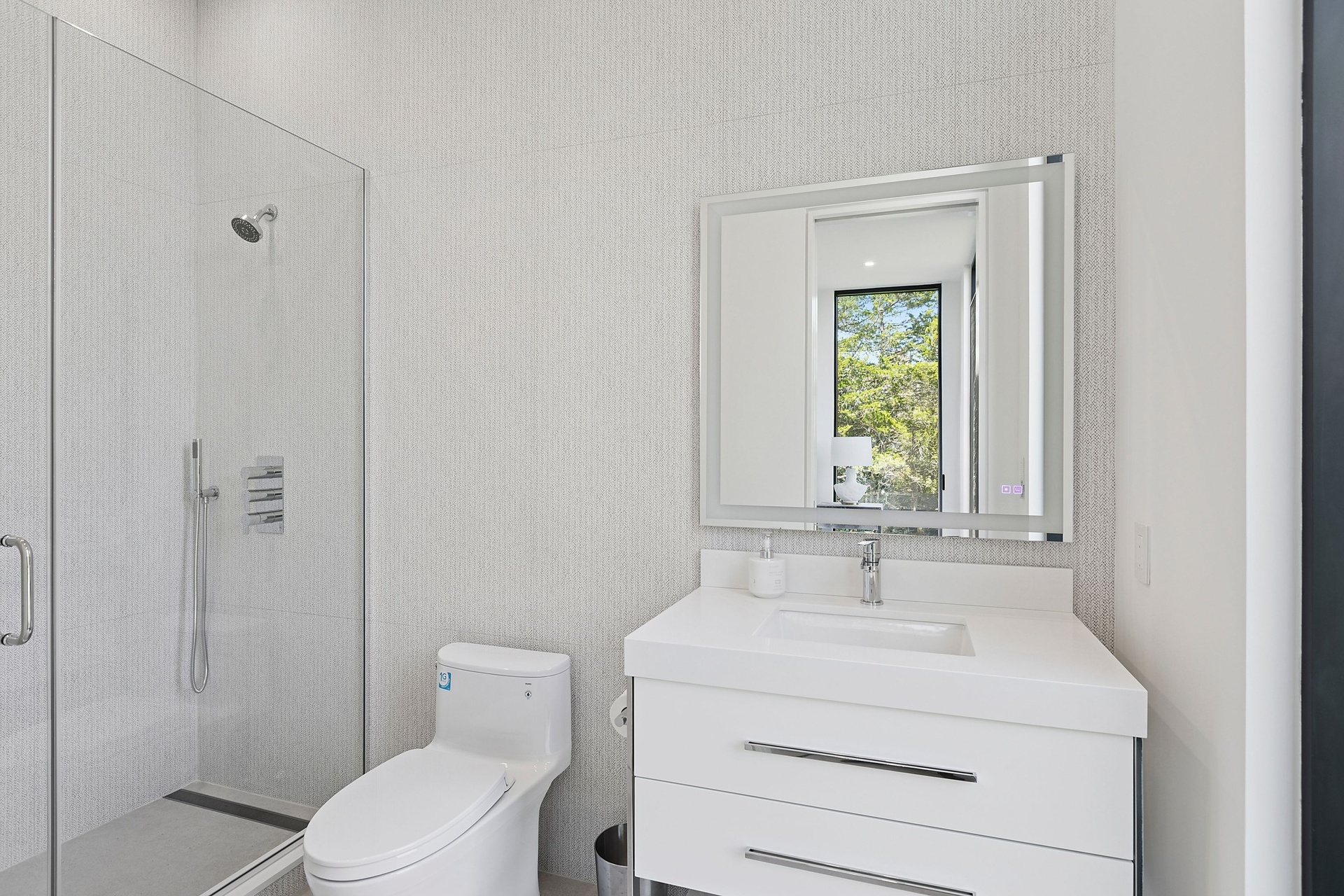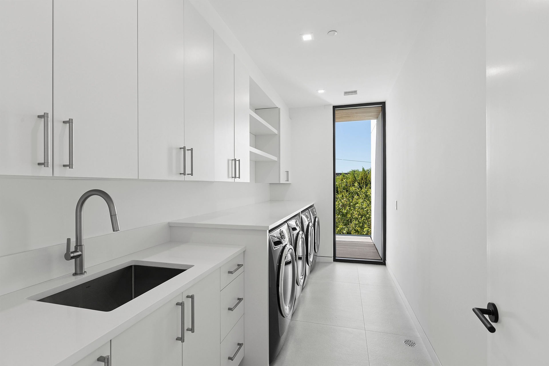 Upstairs, the primary suite is a true retreat, offering a private sitting area, spa bath, oversized custom closet, and a private terrace. Three additional en suite bedrooms, a second laundry, and rooftop access expand the lifestyle offerings, where an expansive roof deck affords panoramic ocean-to-bay vistas.