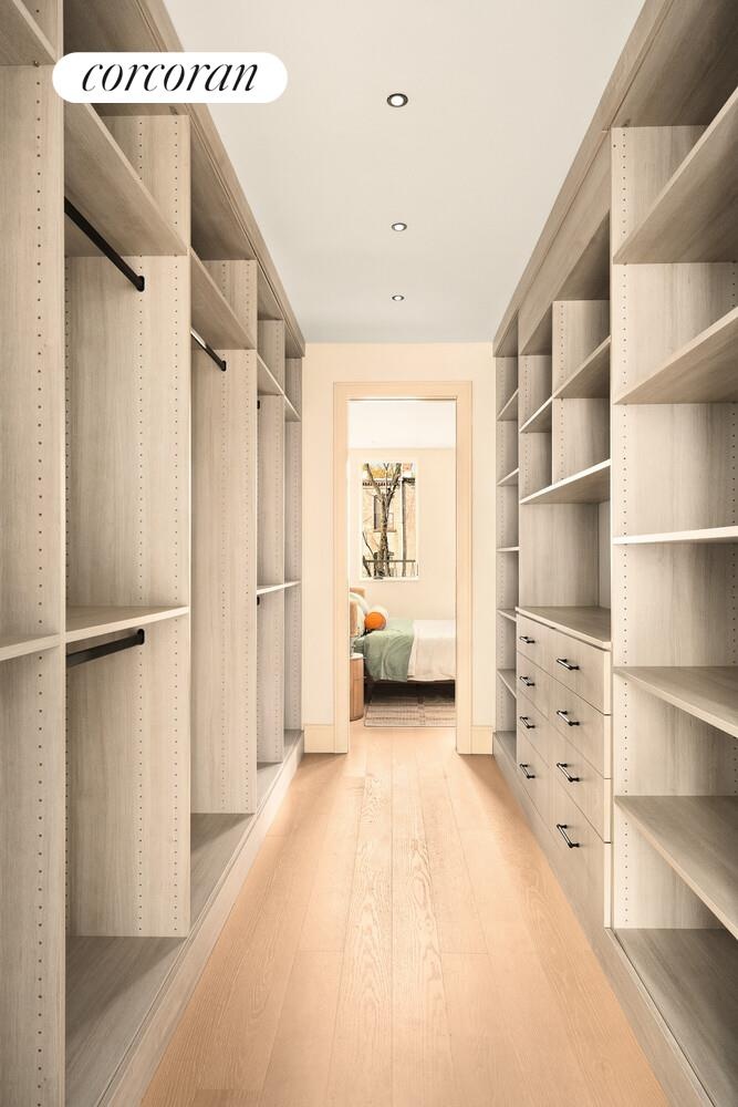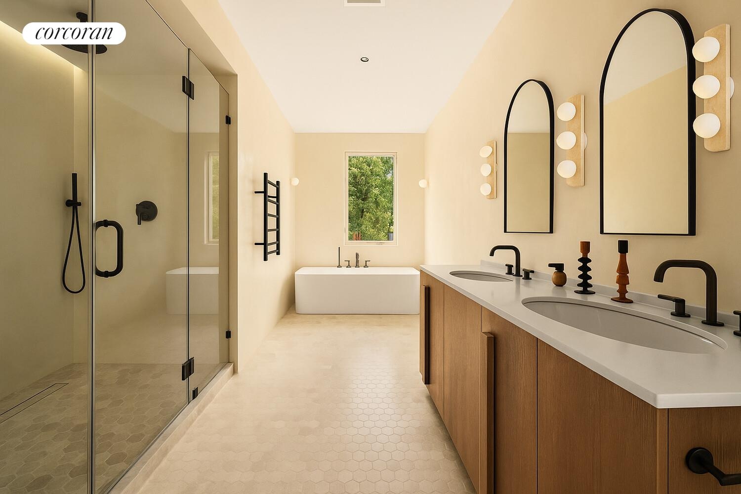 A custom rounded bleached oak staircase ascends to the full-floor primary suite with a king-sized bedroom, private terrace, custom dressing room, and a spa-like bath designed as a calming retreat, with radiant heated Taj Mahal quartzite floors and hand-applied Tadelakt walls that extend seamlessly into the walk-in shower with rain head, cove lighting, and built-in storage. A separate soaking tub, towel warmer, and private water closet with bidet complete the sanctuary. This level also offers a nursery or home office, a linen closet, and a laundry room with washer/dryer, countertop storage, and slop sink.