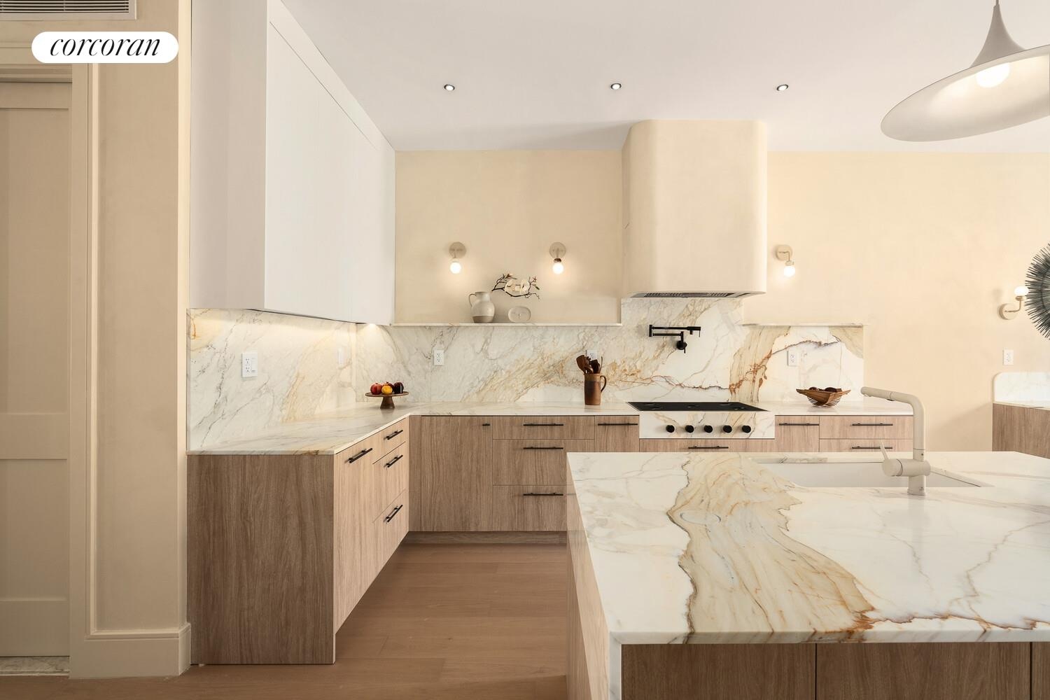 Throughout the home, Marvin windows, oversized baseboards, elegant hardware, wall sconces, and two-inch recessed lighting create a warm, inviting atmosphere. With southern exposure, central air, multi-zoned sound, and designer finishes, 231 Macon Street offers scale, light, and contemporary luxury with a refined sense of calm woven throughout.