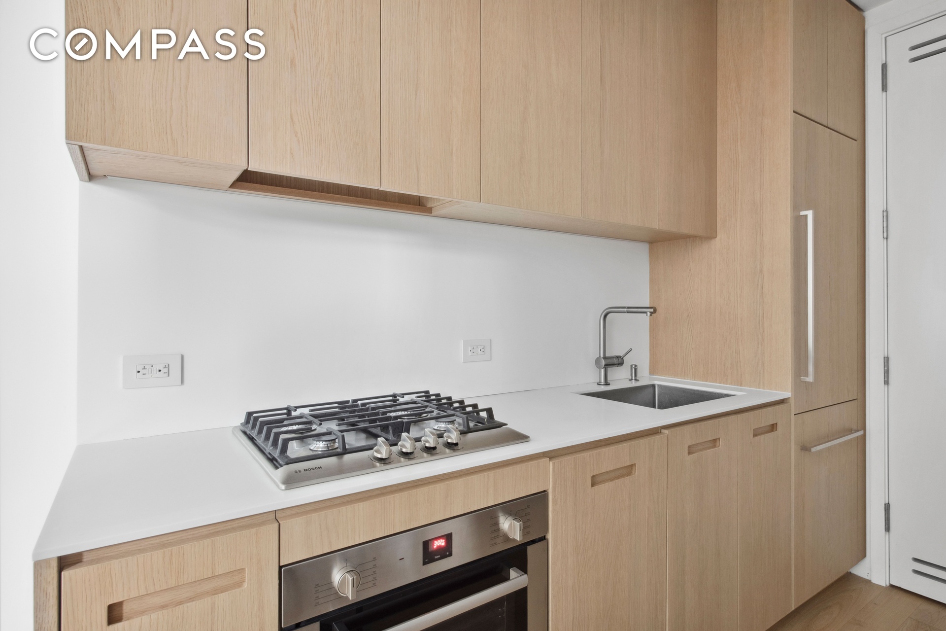 The open layout of this corner studio maximizes every square foot, with floor to ceiling windows letting Western and Northern sunlight to stream throughout the apartment. The kitchen features white Corian countertops and backsplashes, blonde wood cabinets, and Bosch appliances: a paneled refrigerator and dishwasher, gas cooktop, convection oven, and Grohe faucet.