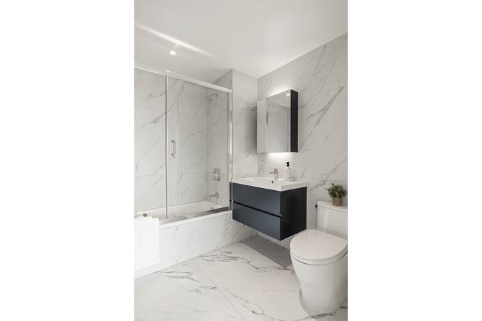 The well designed bathroom offers clean modern lines, large-format tile, and a floating vanity with ample storage.