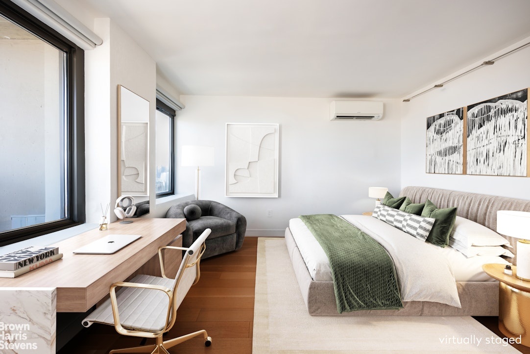 Additional thoughtful details include discreet TV wall behind sliding door, built-in entry storage, motorized shades, Lutron-controlled lighting, anti-UV window films, and split AC units in the bedrooms.