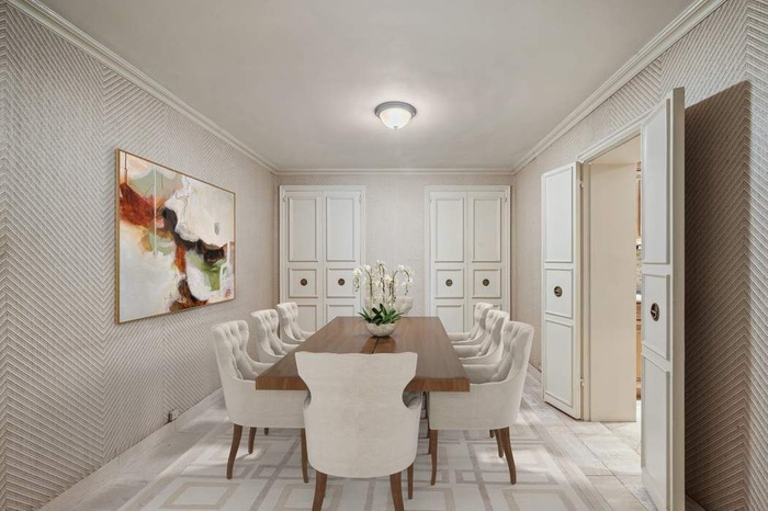 The residence welcomes you with an inviting entry foyer featuring two coat closets and a powder room, setting the stage for the home’s well-considered layout. Exceptional storage is a hallmark of this apartment, with custom built-ins and deep closets seamlessly integrated throughout.