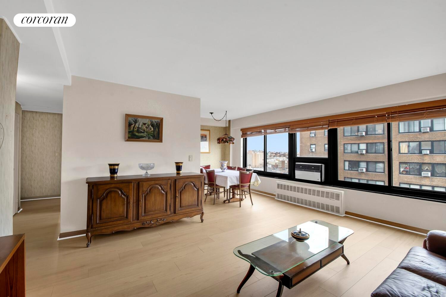 OH, Saturday, April 4th - BY APPOINTMENT: Perched on a high floor, and with new floors just installed, this bright 2-BR/1-BA residence offers expansive views of Manhattan and western Queens. The LR and open dining area are framed by a wall of oversized sliding glass windows that span the full length of both rooms - perfect for soaking in morning light and capturing striking views of the skyline. The galley kitchen is designed with modern finishes and shares the same sweeping views, creating a seamless flow for cooking, dining, & entertaining.