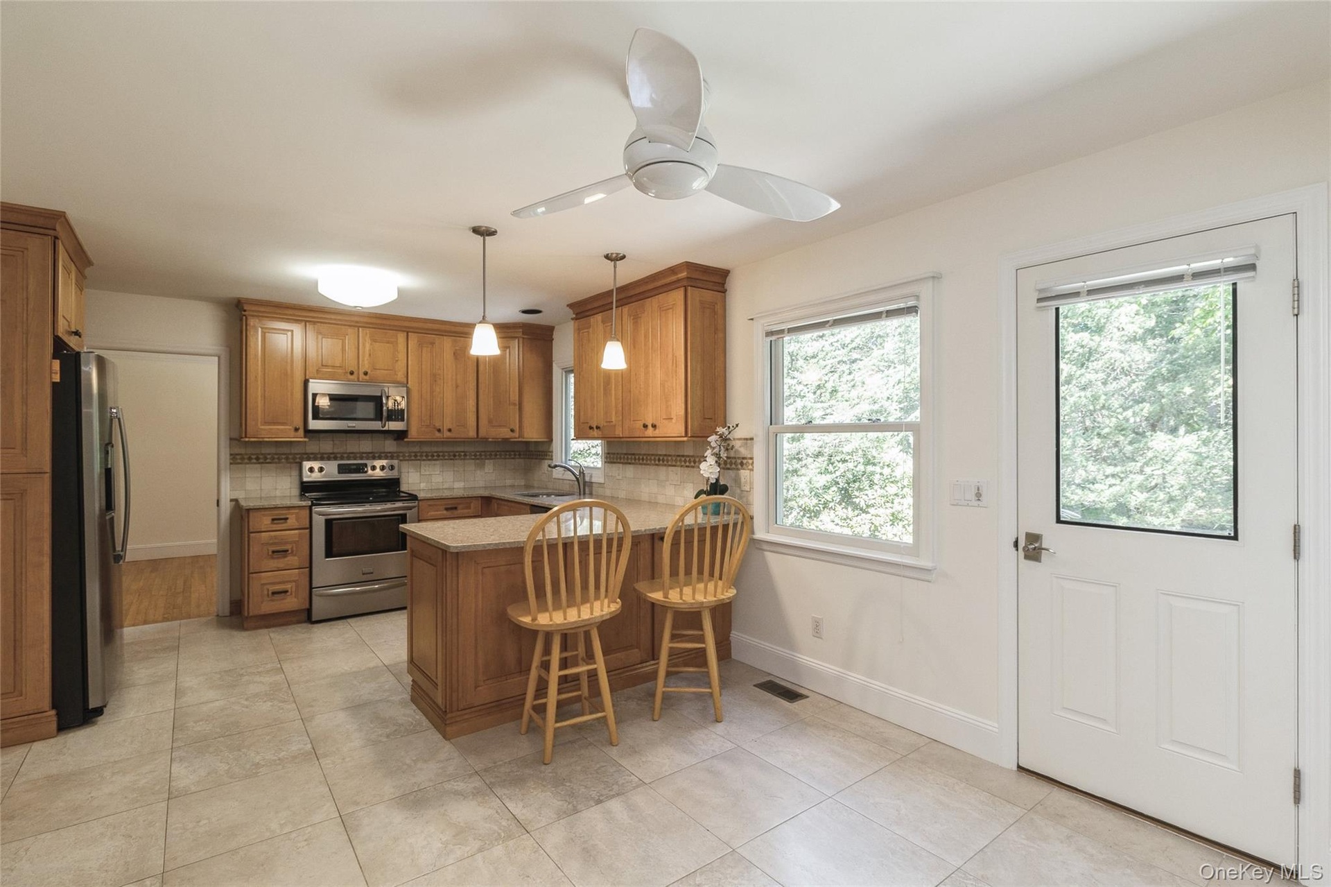 - Kitchen featuring a breakfast bar, decorative backsplash, stainless steel appliances, a peninsula, and brown cabinets
