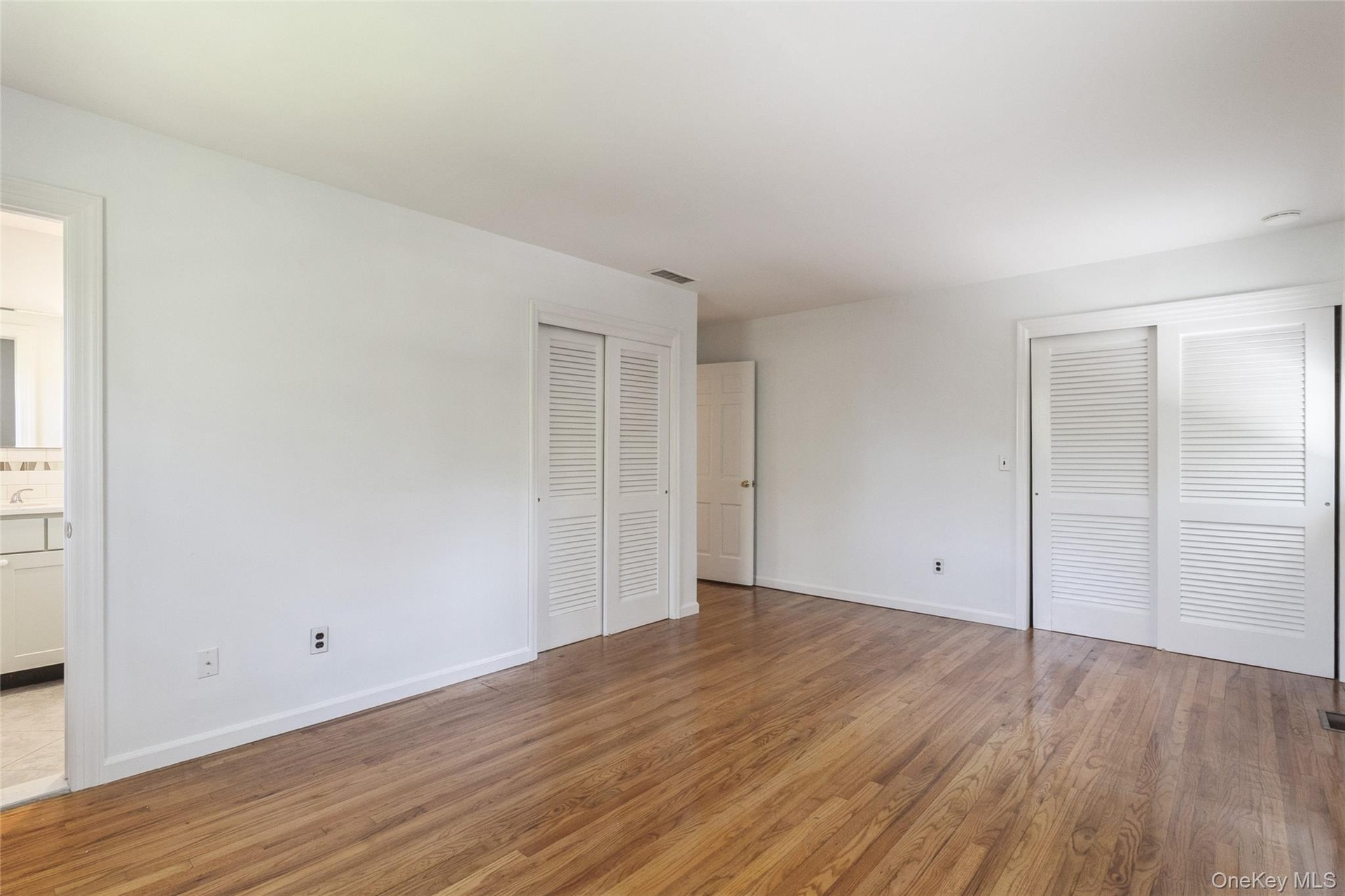 - Unfurnished bedroom featuring multiple closets, light wood finished floors, and connected bathroom