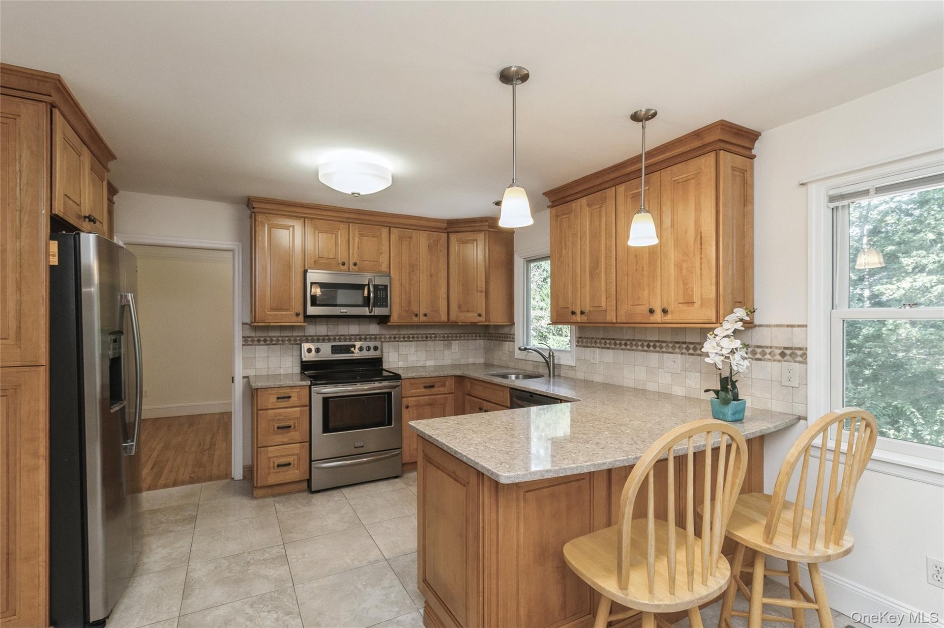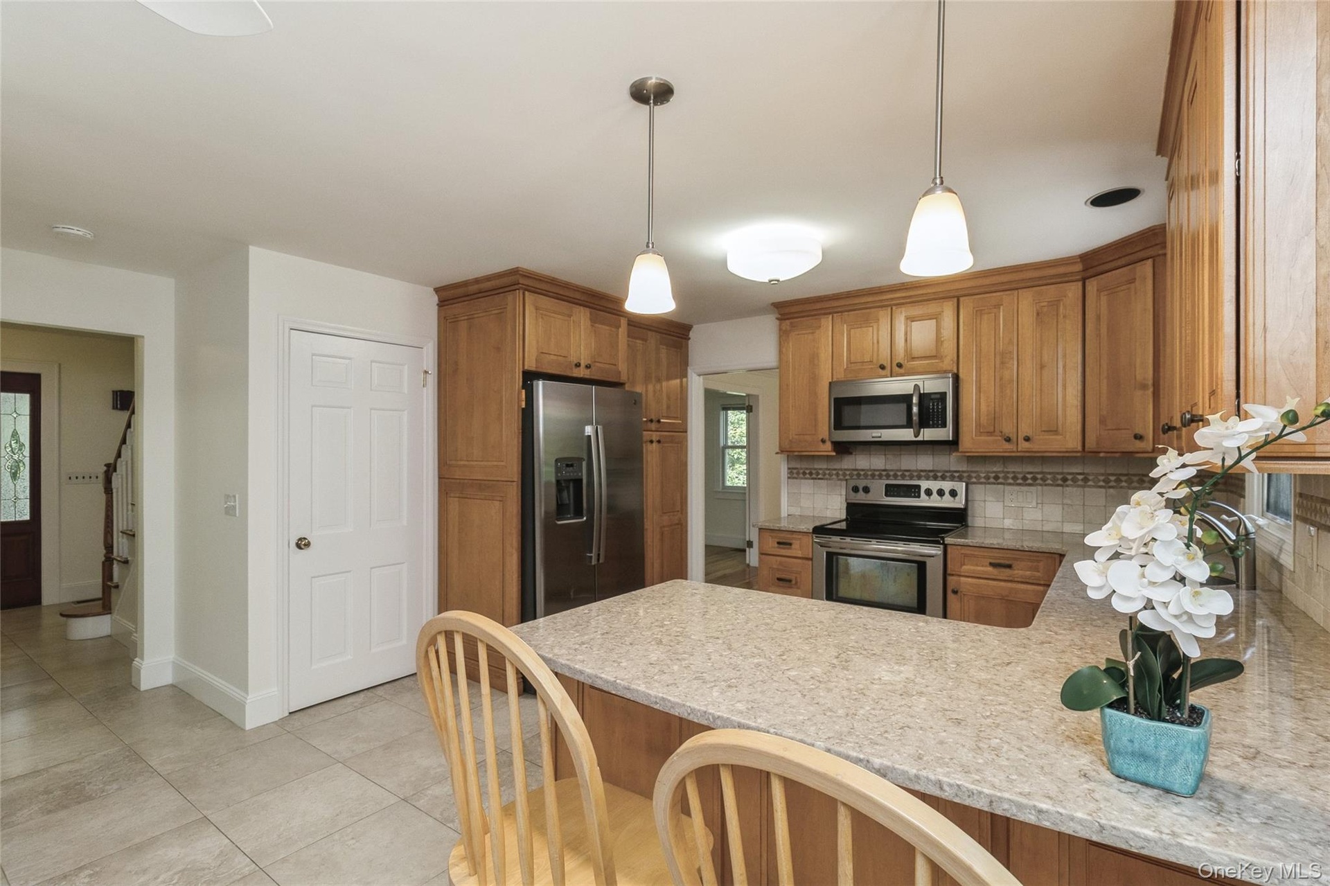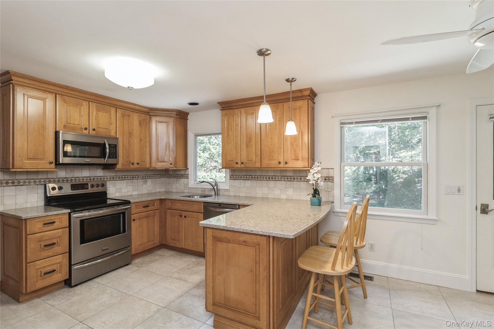- Kitchen featuring a peninsula, stainless steel appliances, hanging light fixtures, tasteful backsplash, and light stone counters