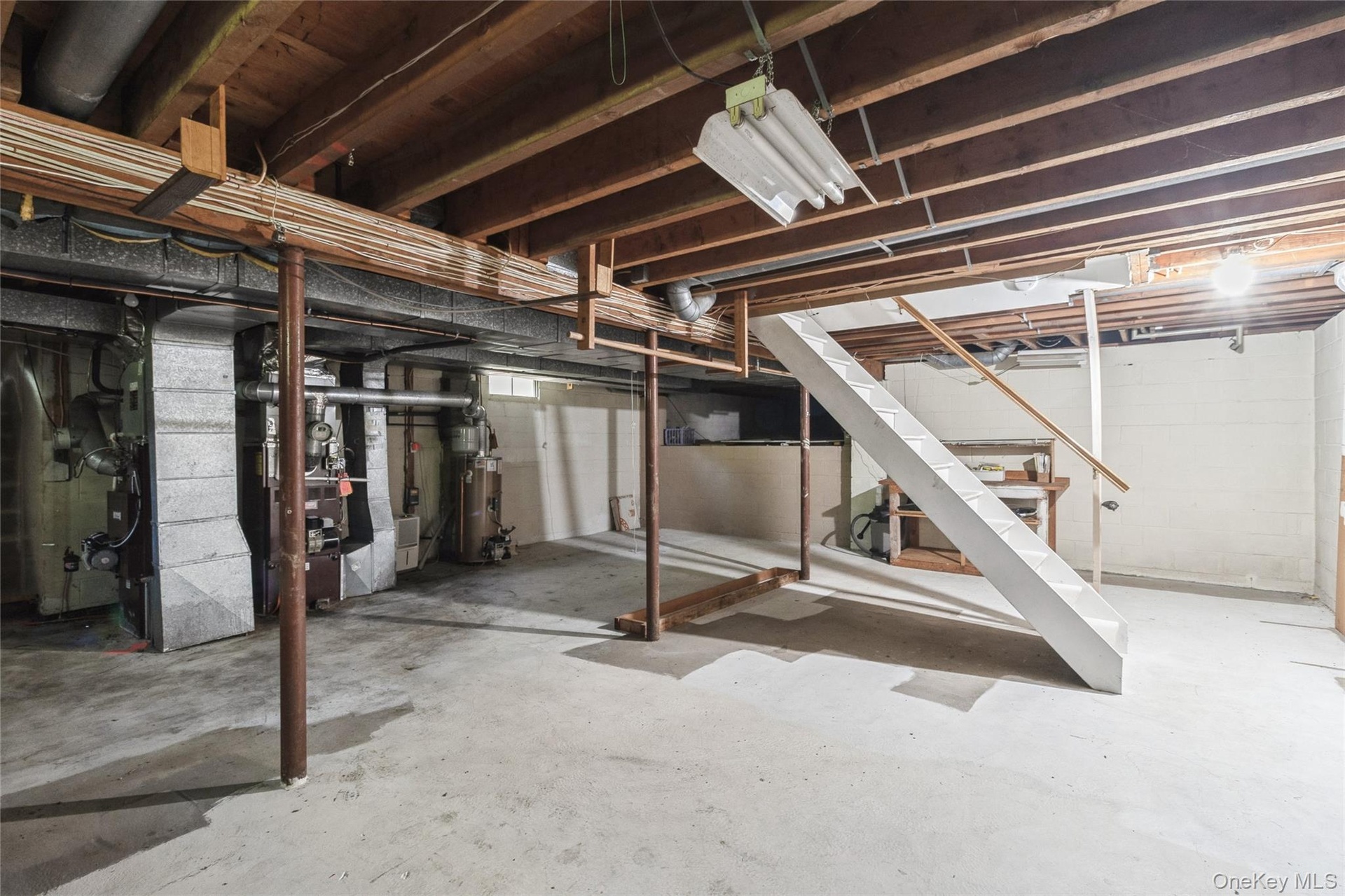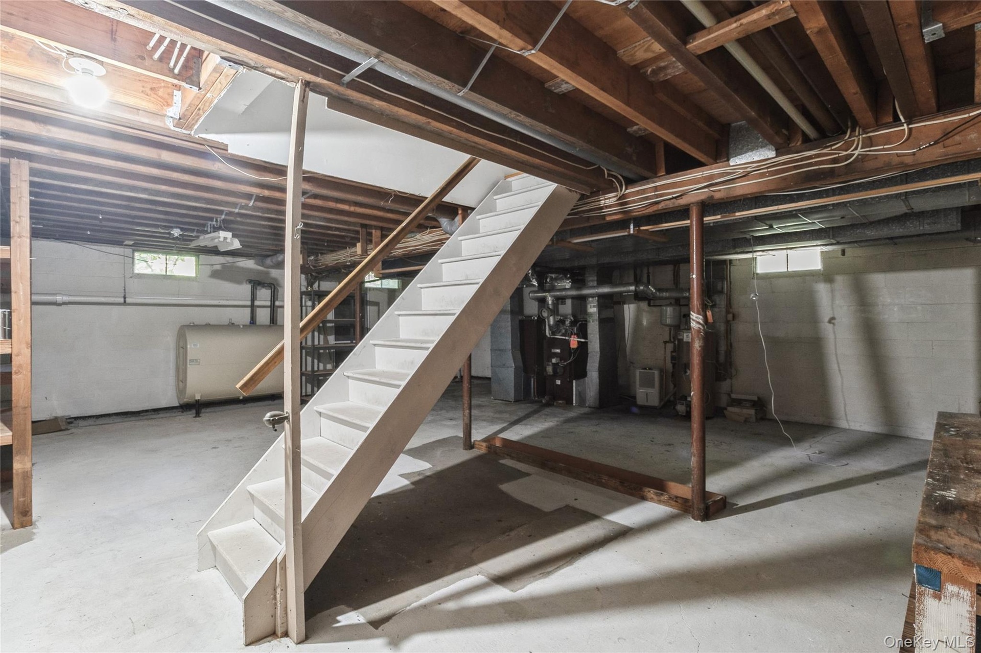 - Unfinished below grade area with stairs, heating unit, and water heater