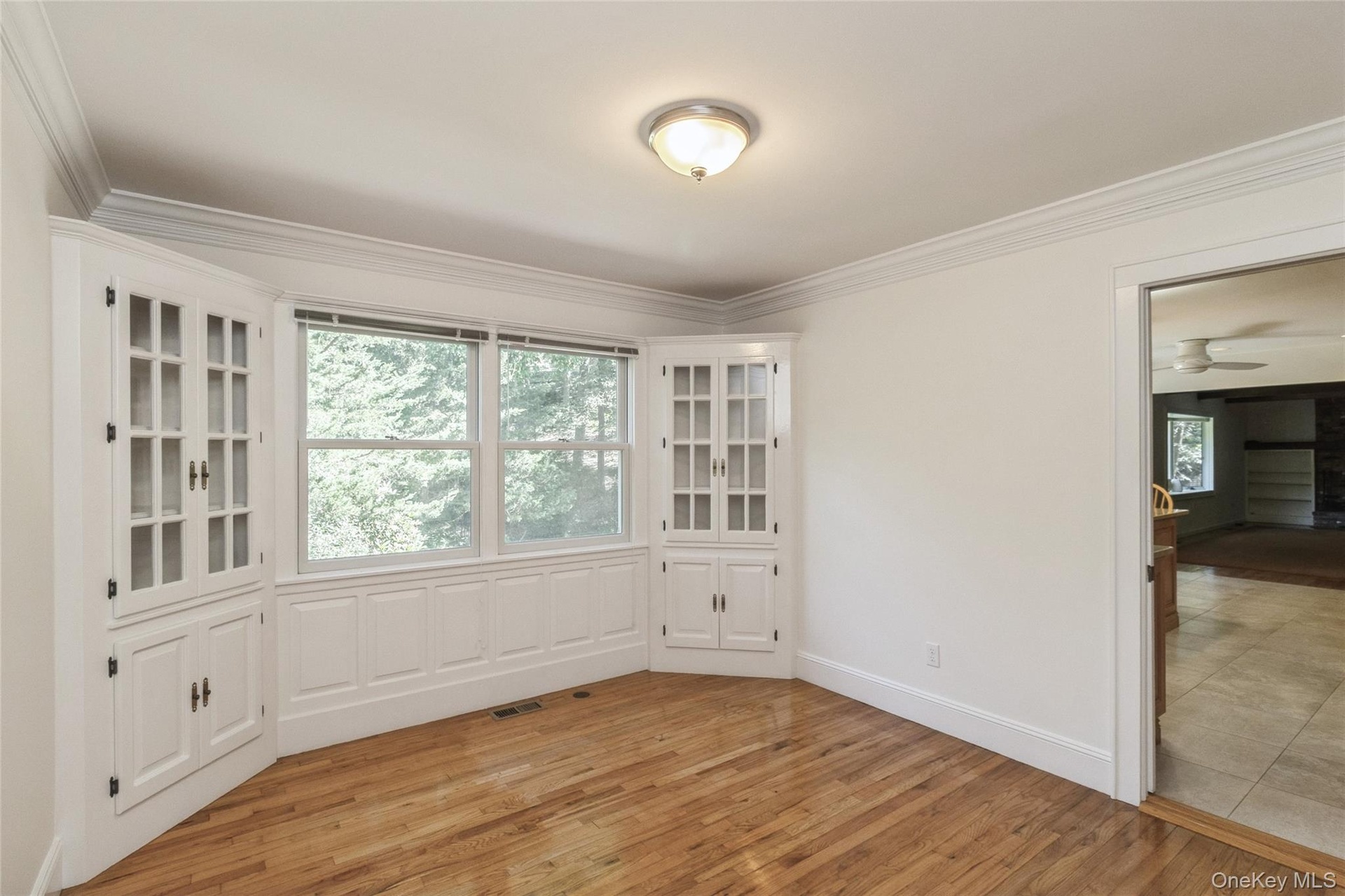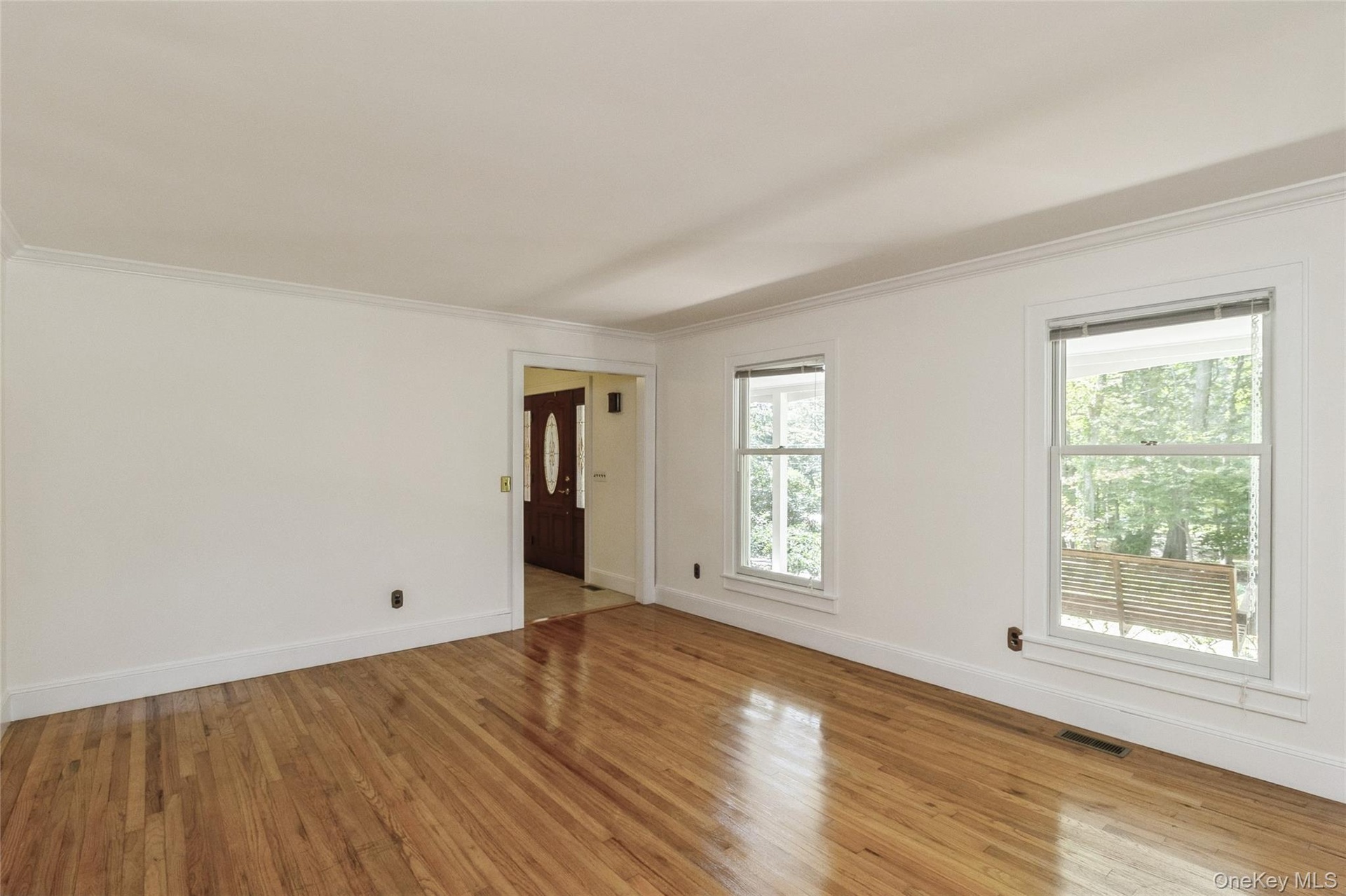 - Empty room with healthy amount of natural light, light wood-type flooring, and ornamental molding
