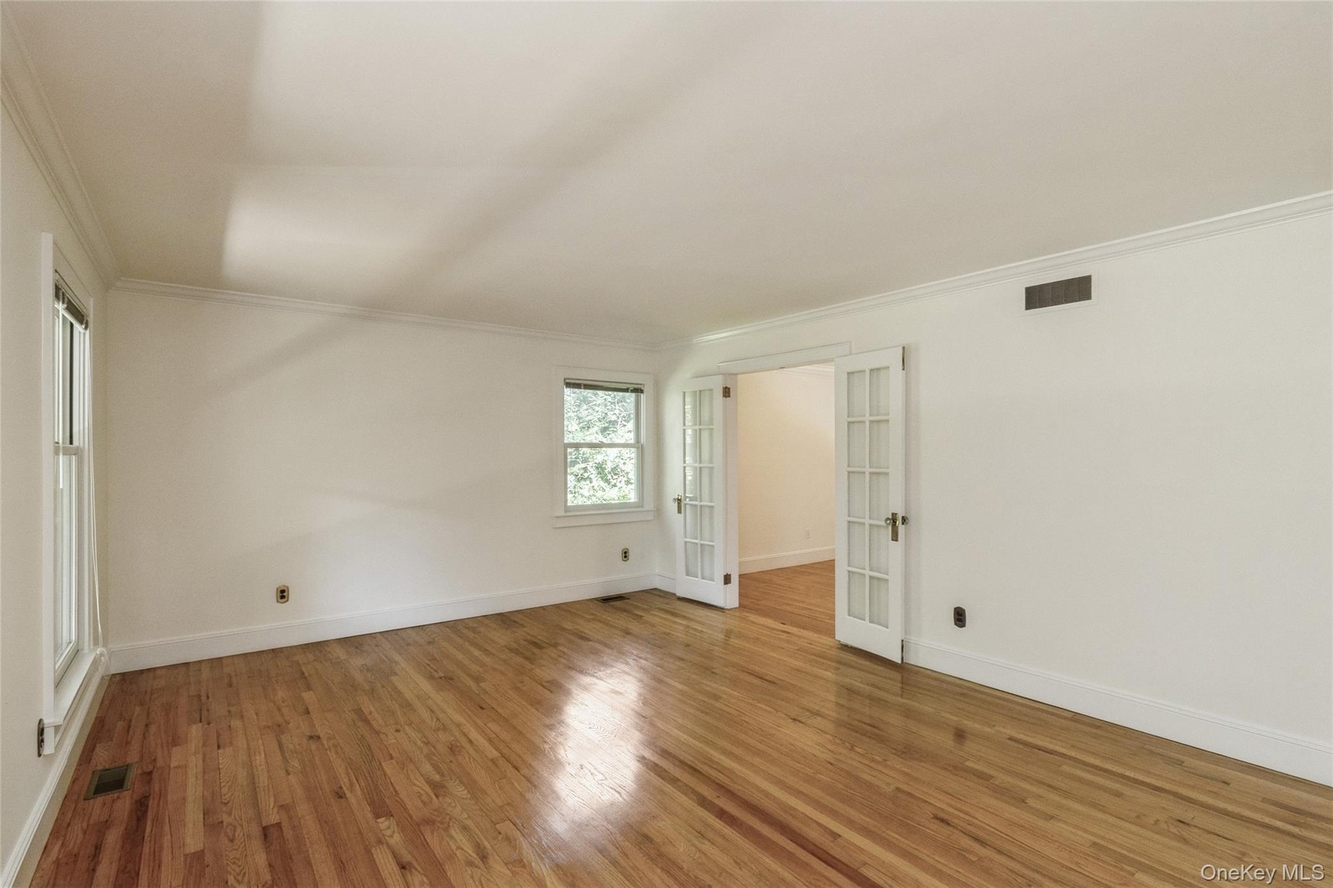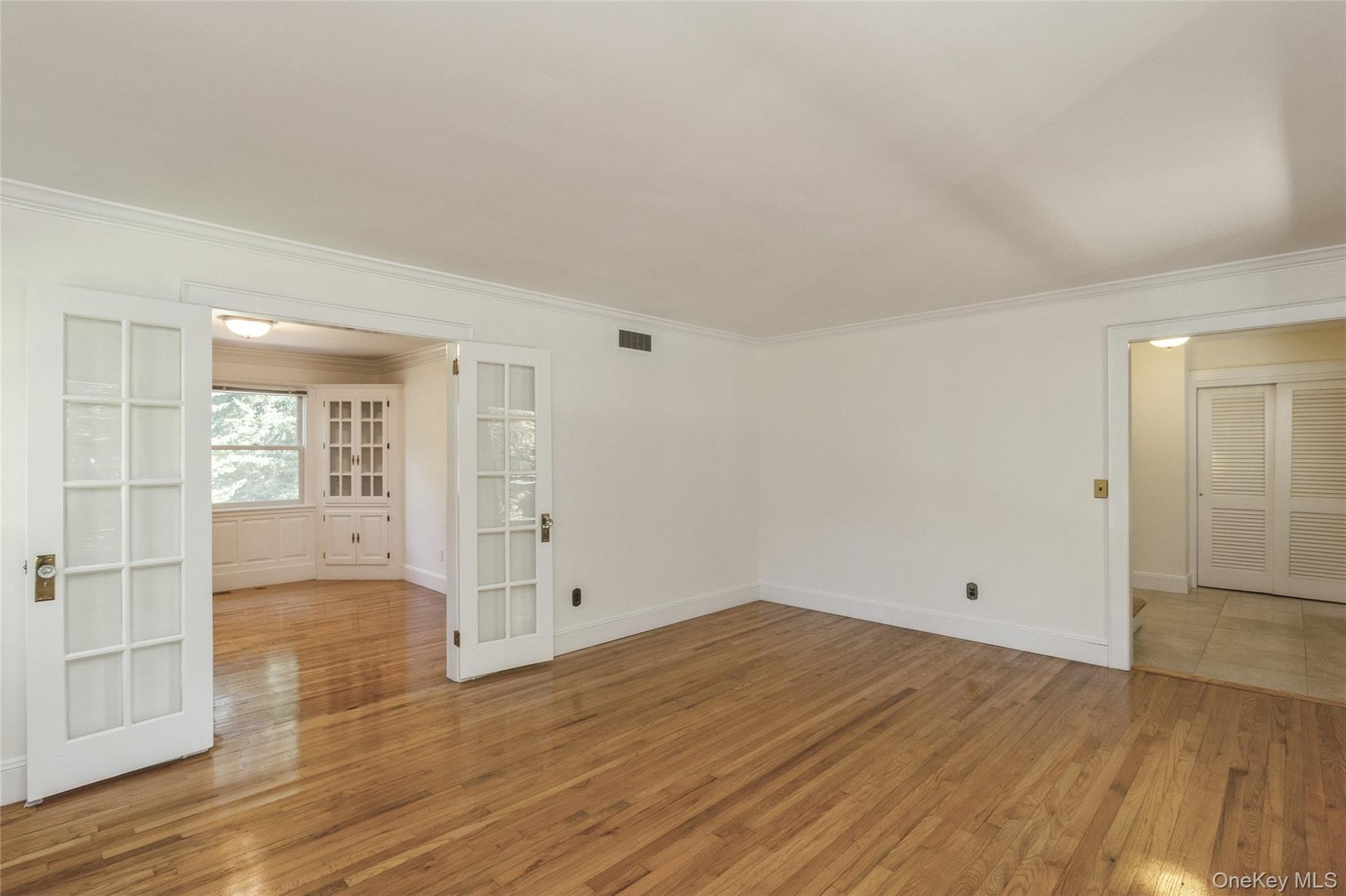 - Unfurnished room featuring french doors, light wood finished floors, and ornamental molding