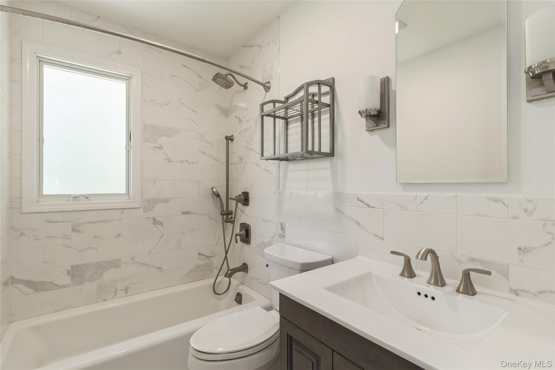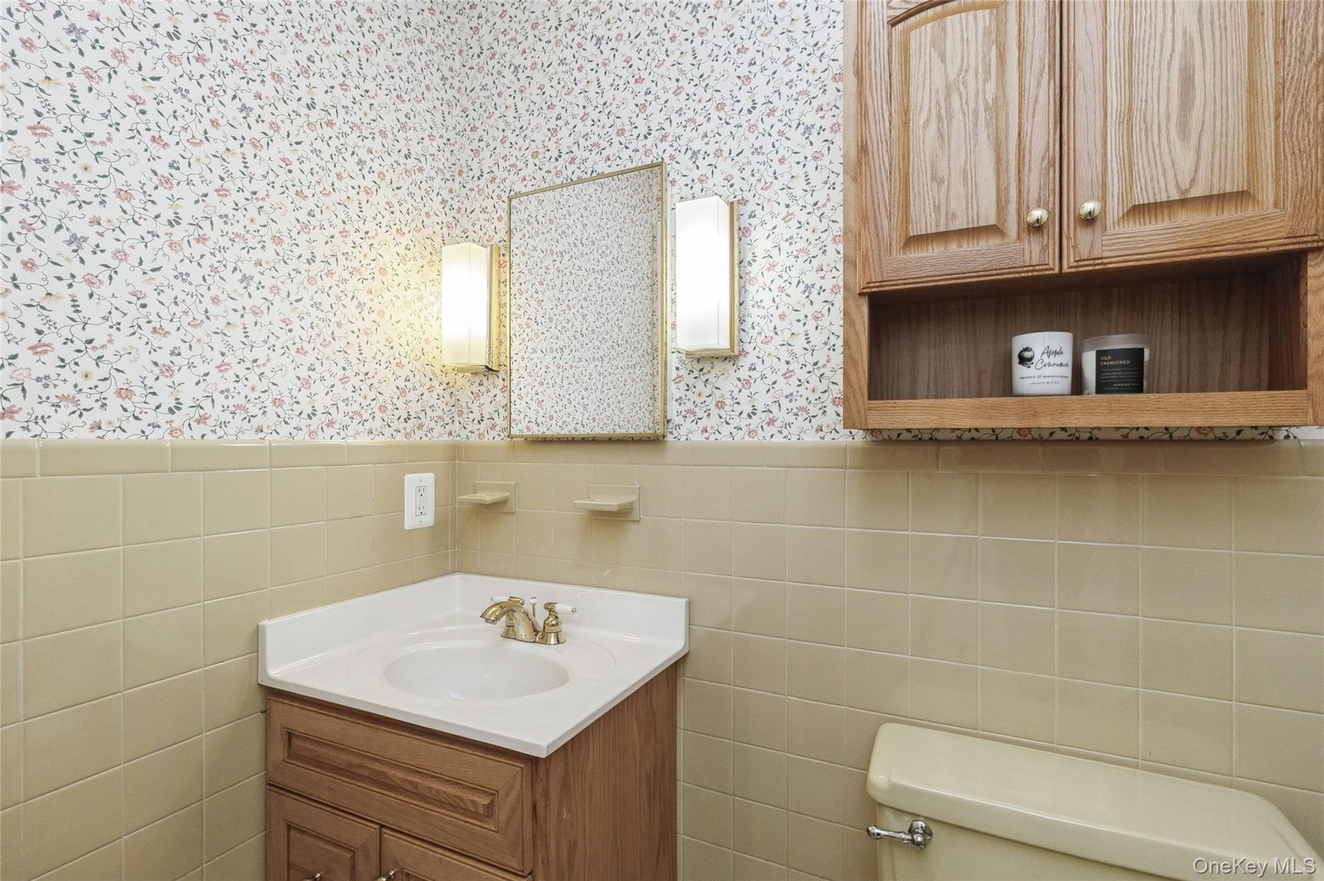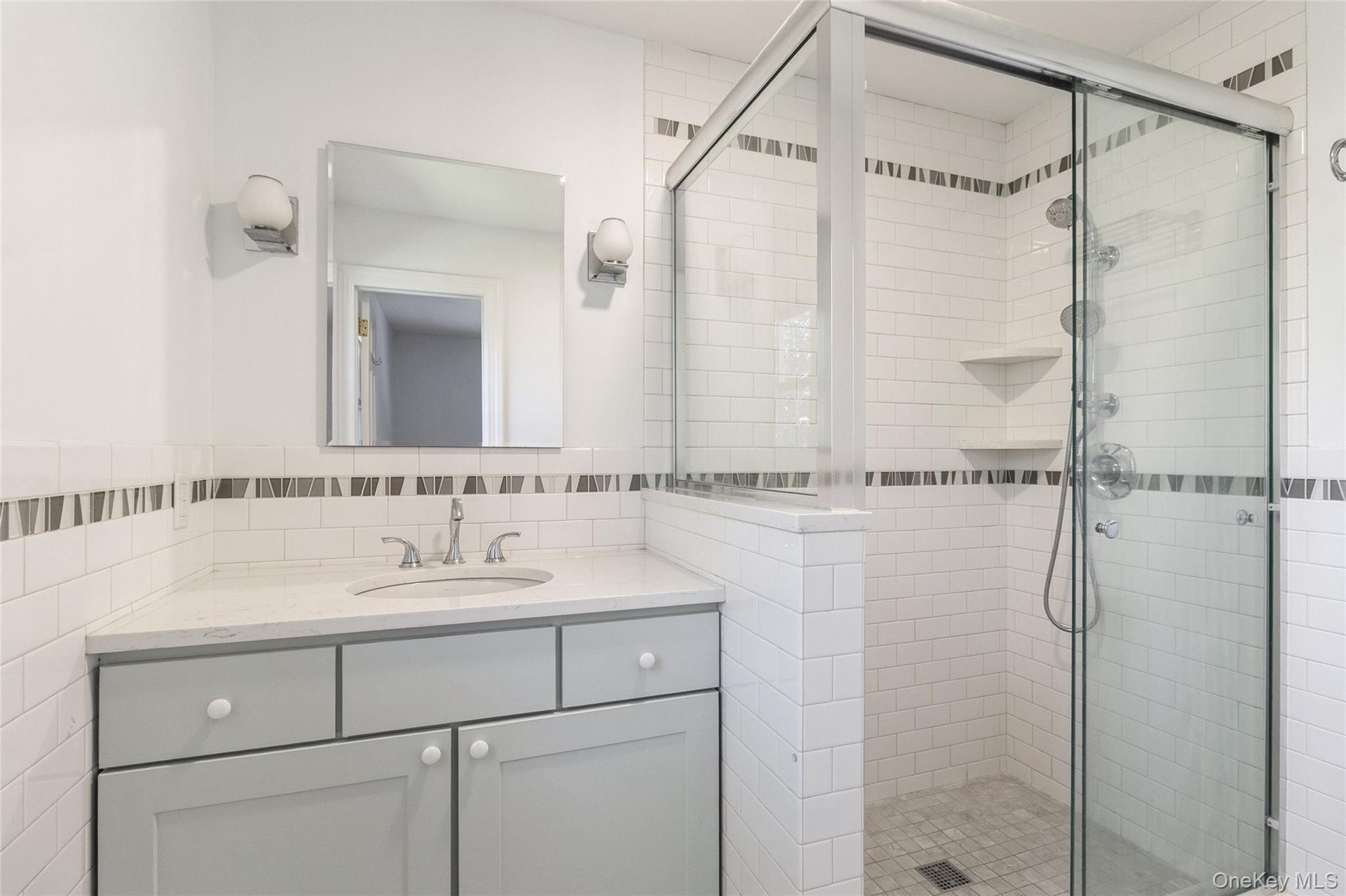 - Full bathroom featuring vanity, tile walls, and a stall shower