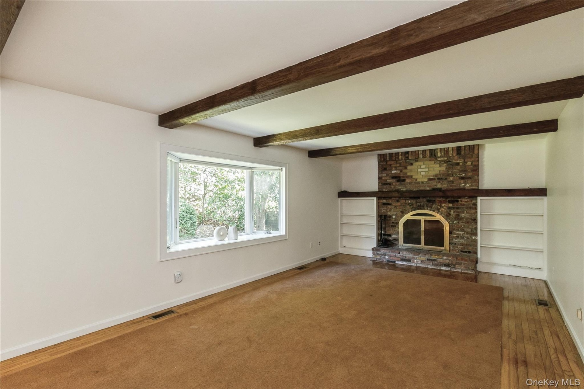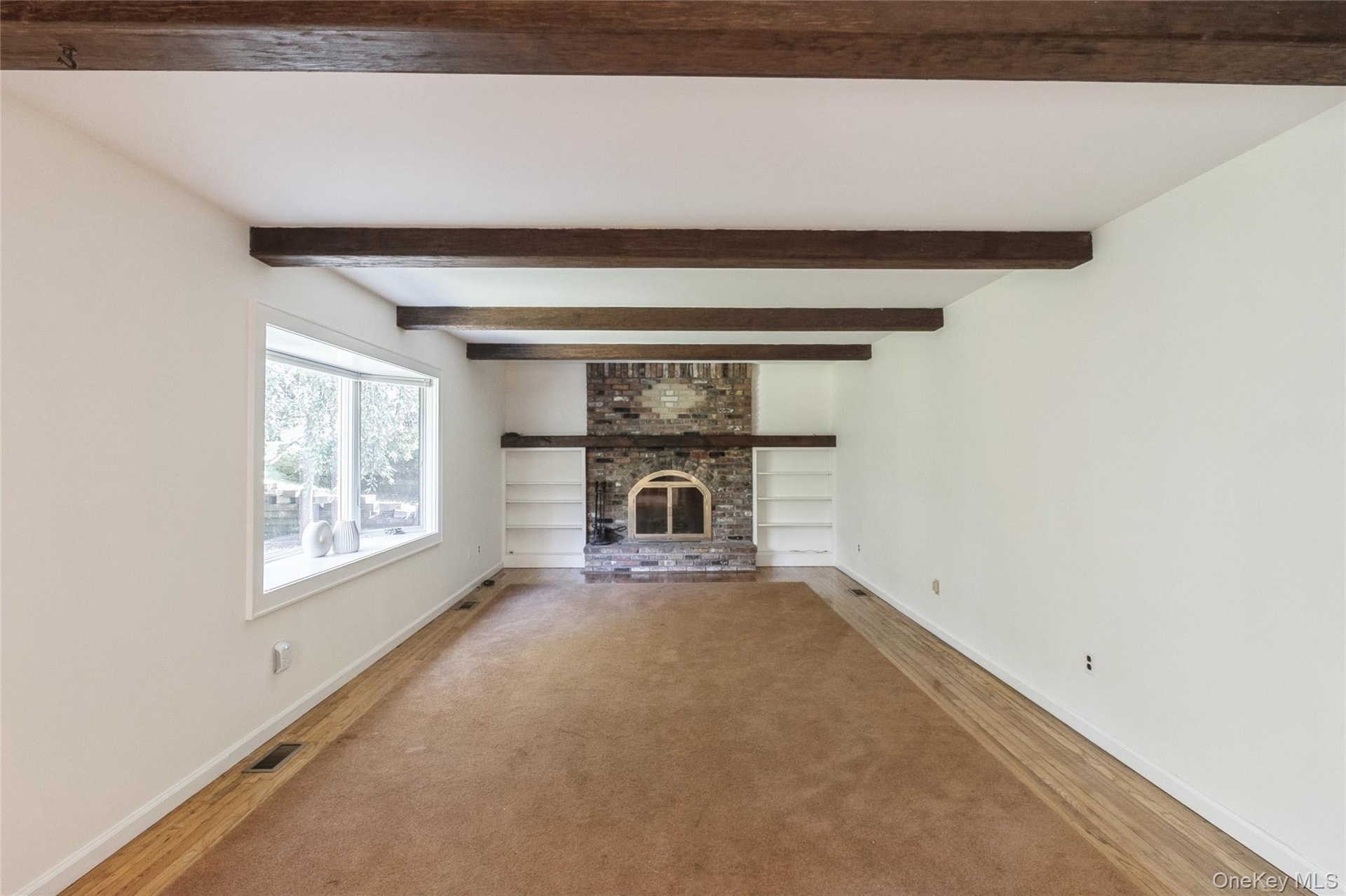 - Unfurnished living room with a brick fireplace, beamed ceiling, and wood finished floors