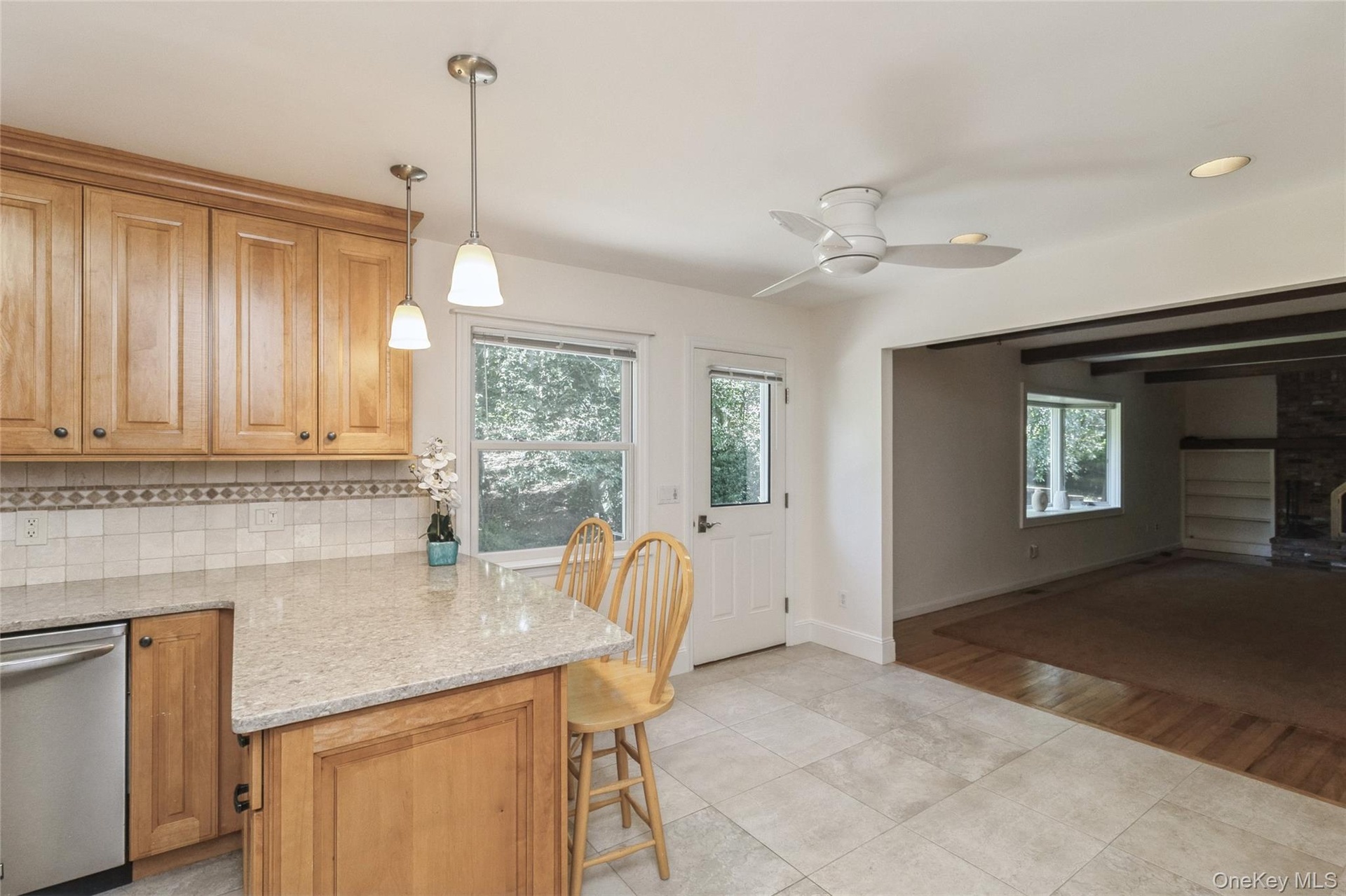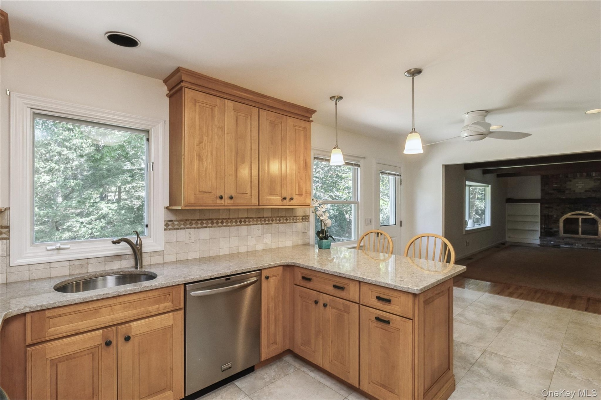- Kitchen with light stone countertops, stainless steel dishwasher, a peninsula, hanging light fixtures, and backsplash
