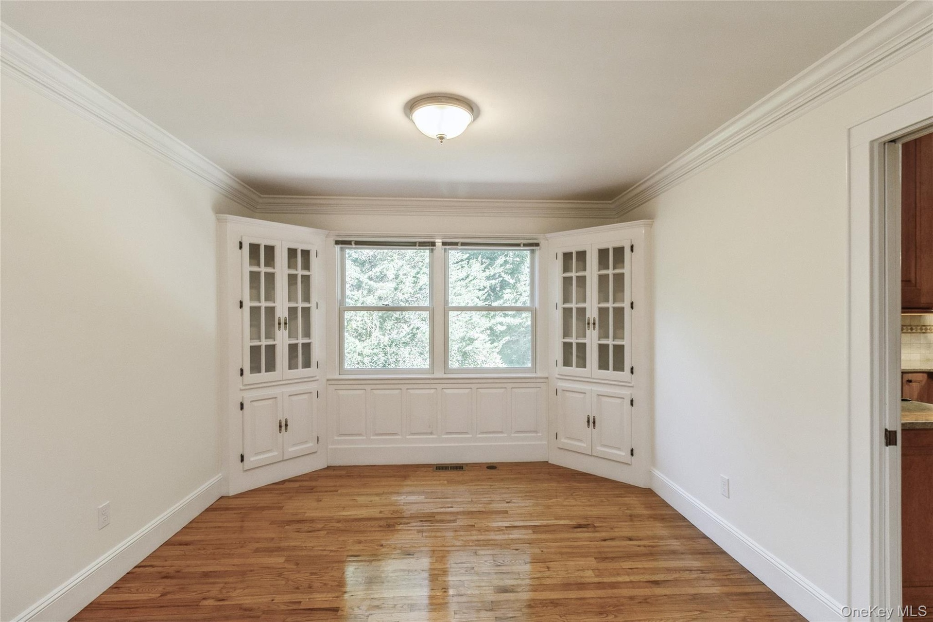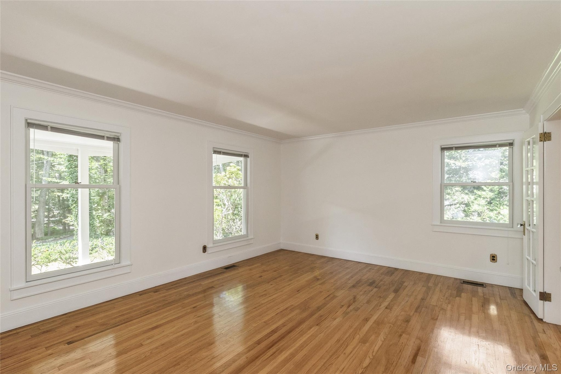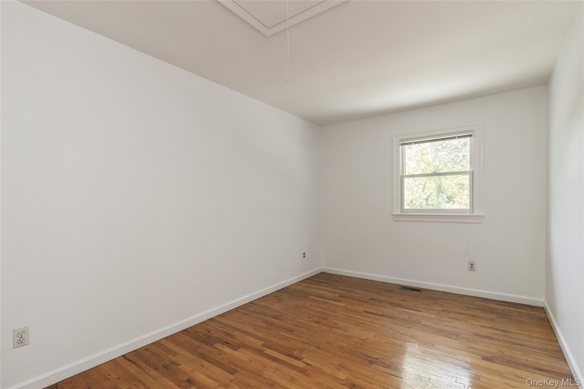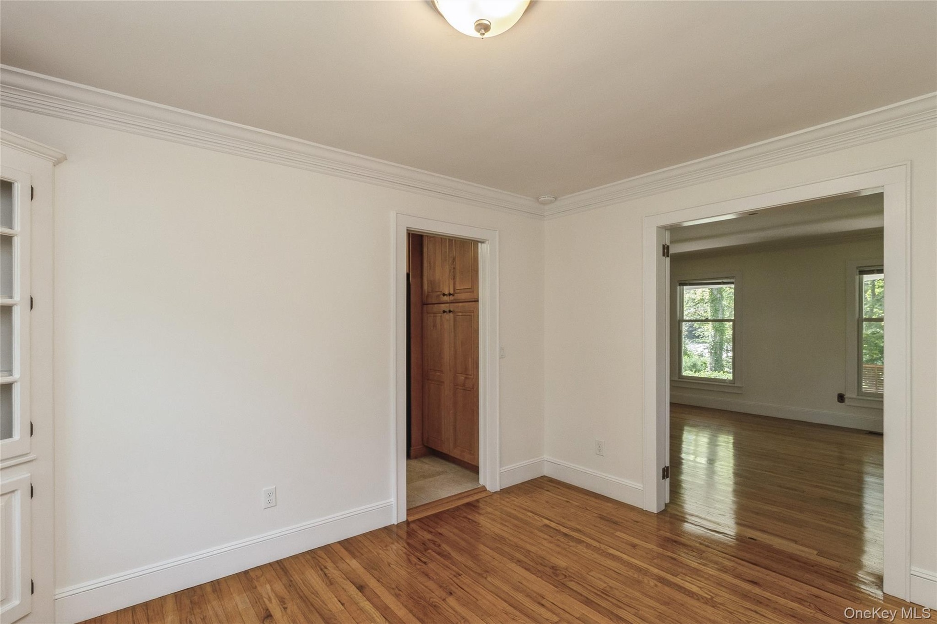 - Unfurnished bedroom with wood finished floors and ornamental molding