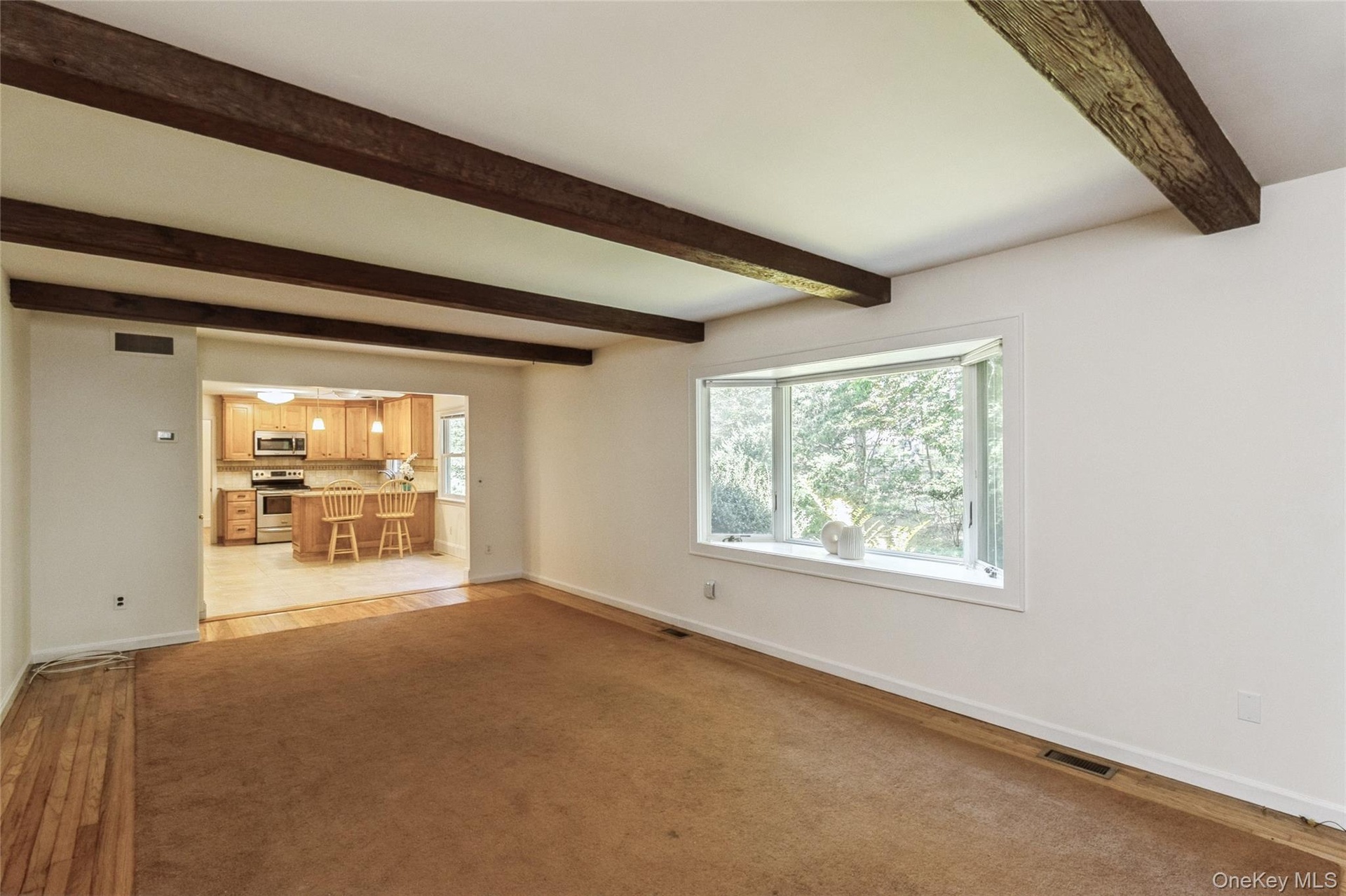 - Unfurnished living room featuring beam ceiling, healthy amount of natural light, and light wood-style floors