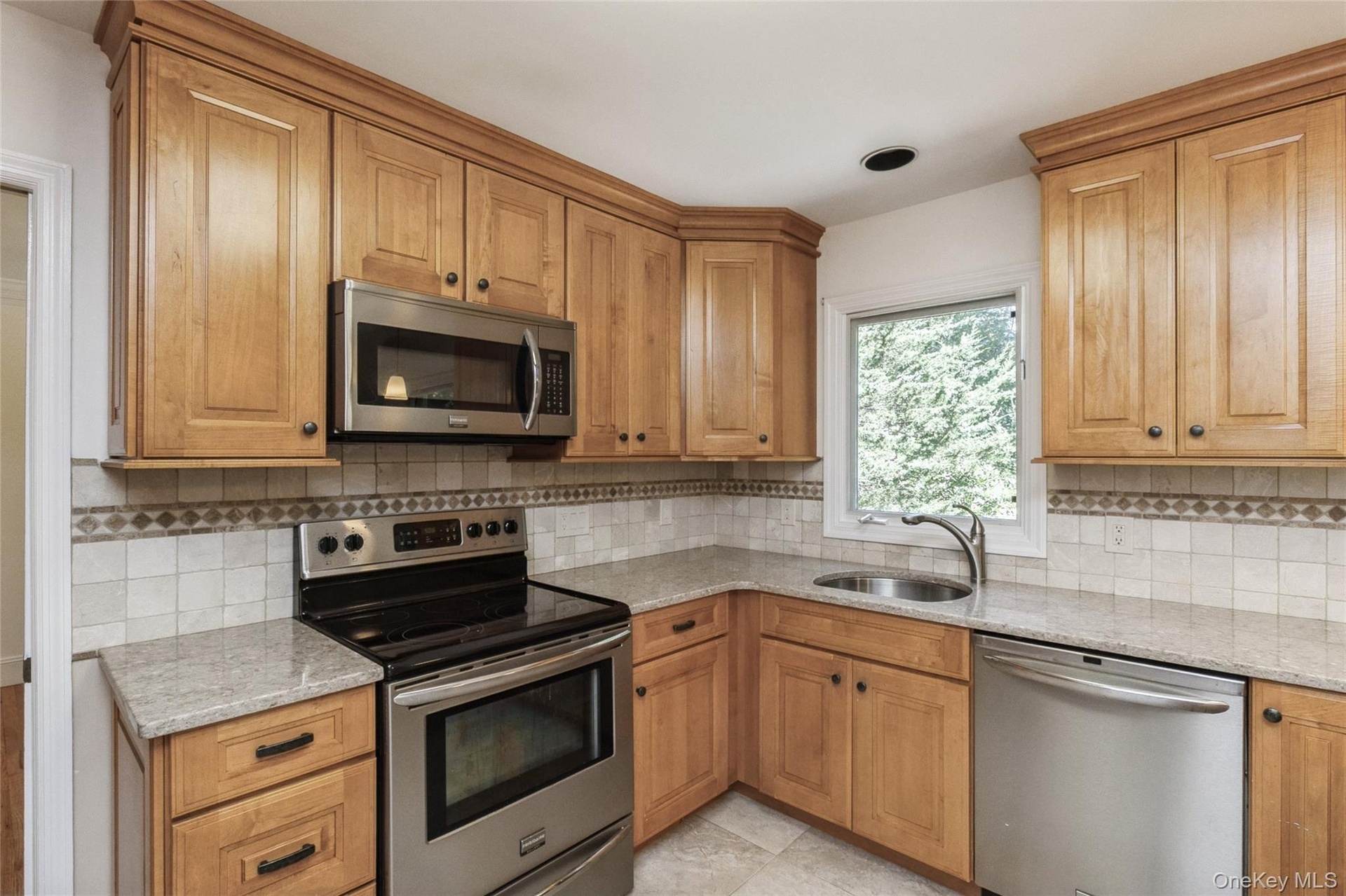 - Kitchen with appliances with stainless steel finishes, light stone countertops, tasteful backsplash, and brown cabinetry